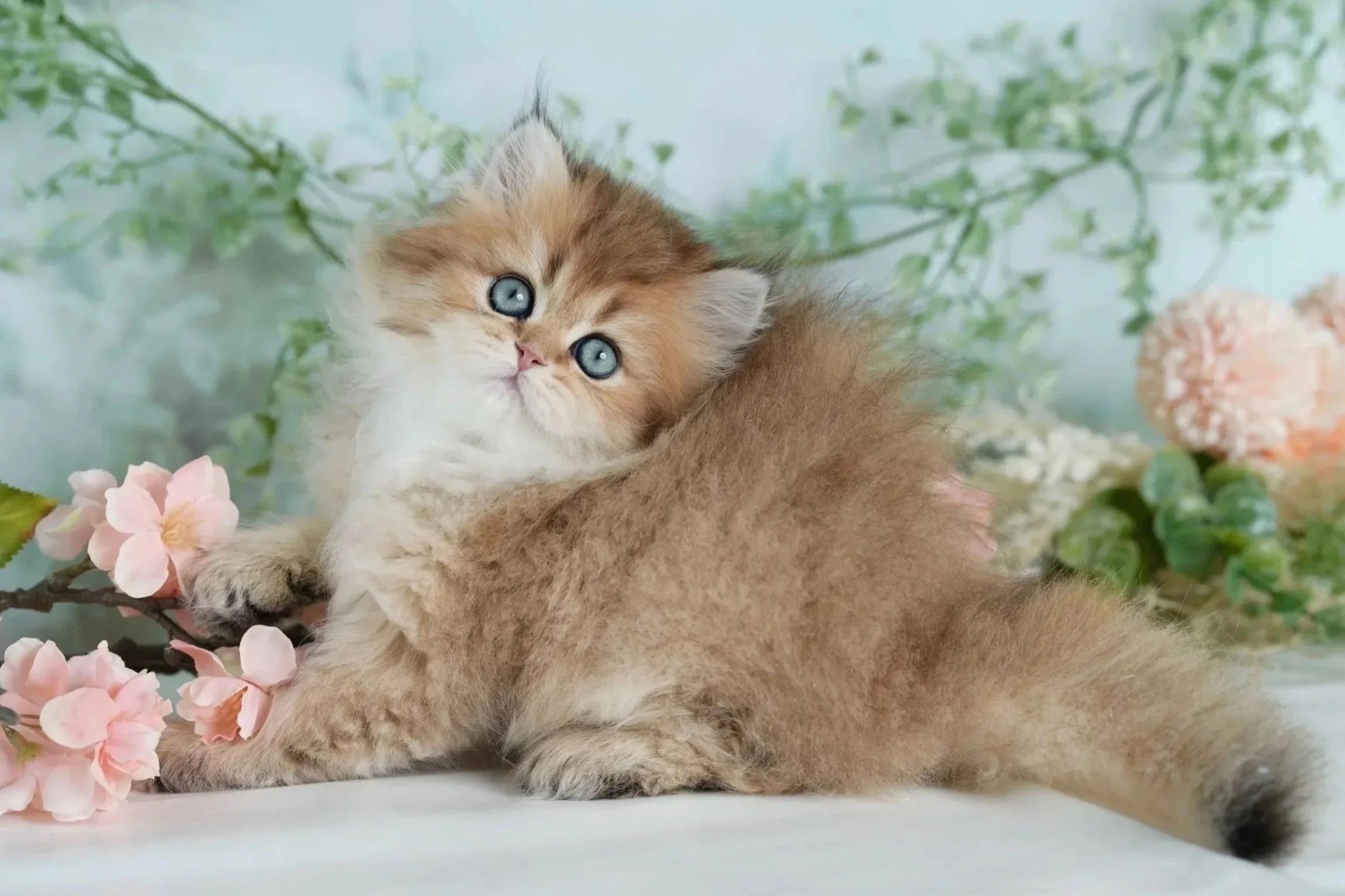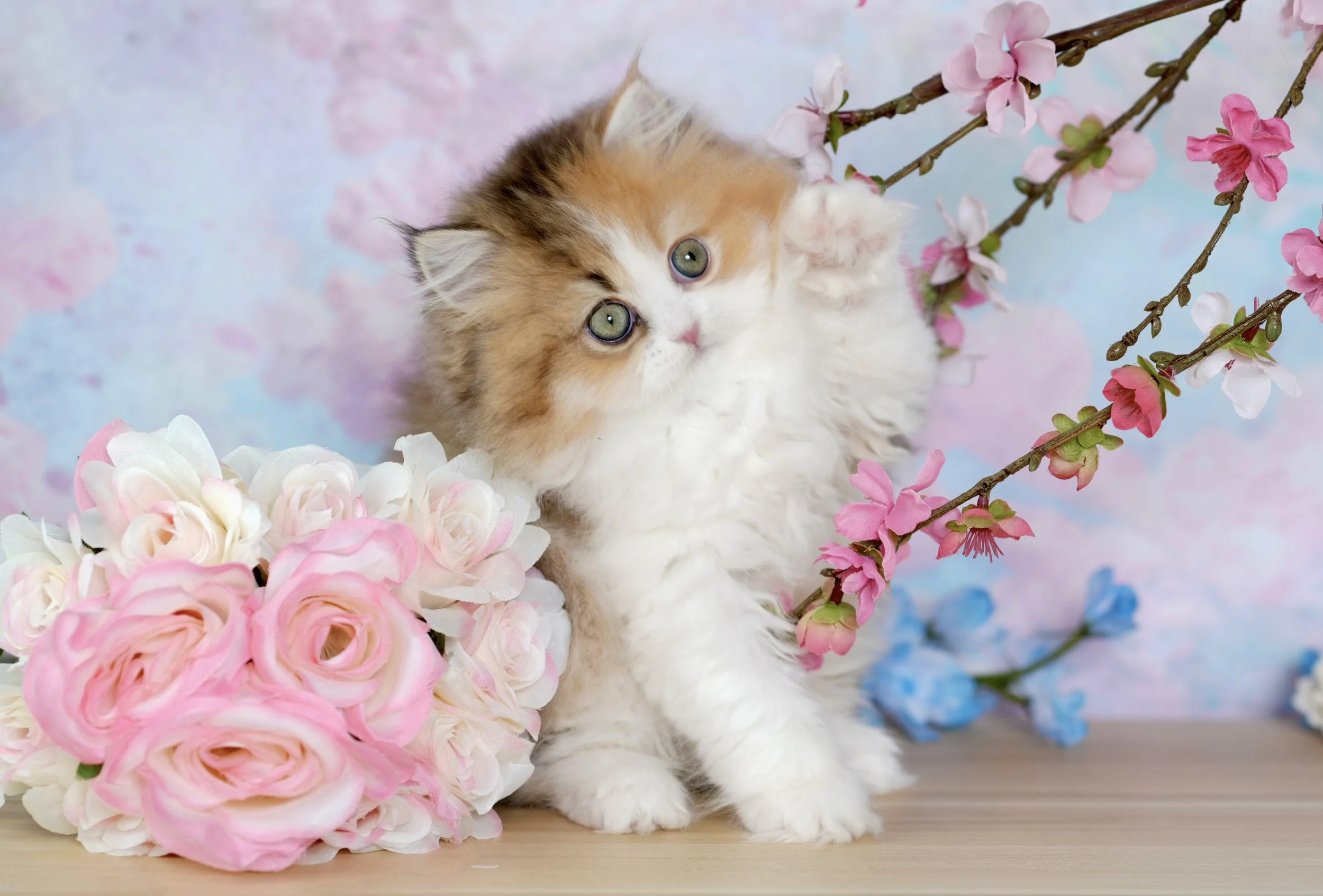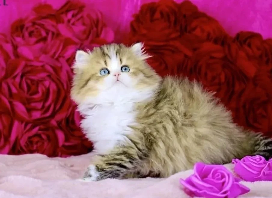 A fluffy kitten with a mix of brown, white, and black fur, lying on a pink surface with a background of red and pink roses.
