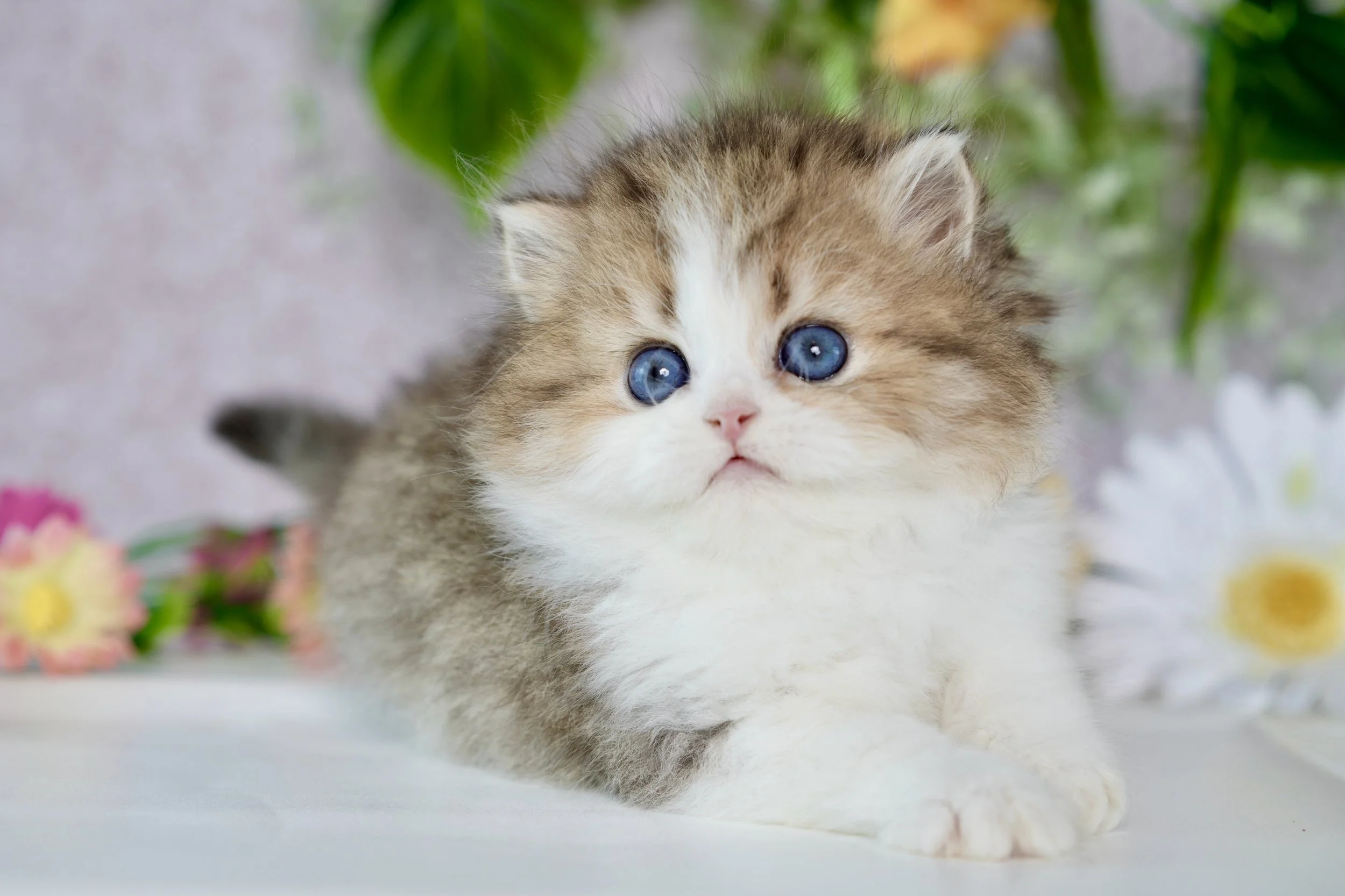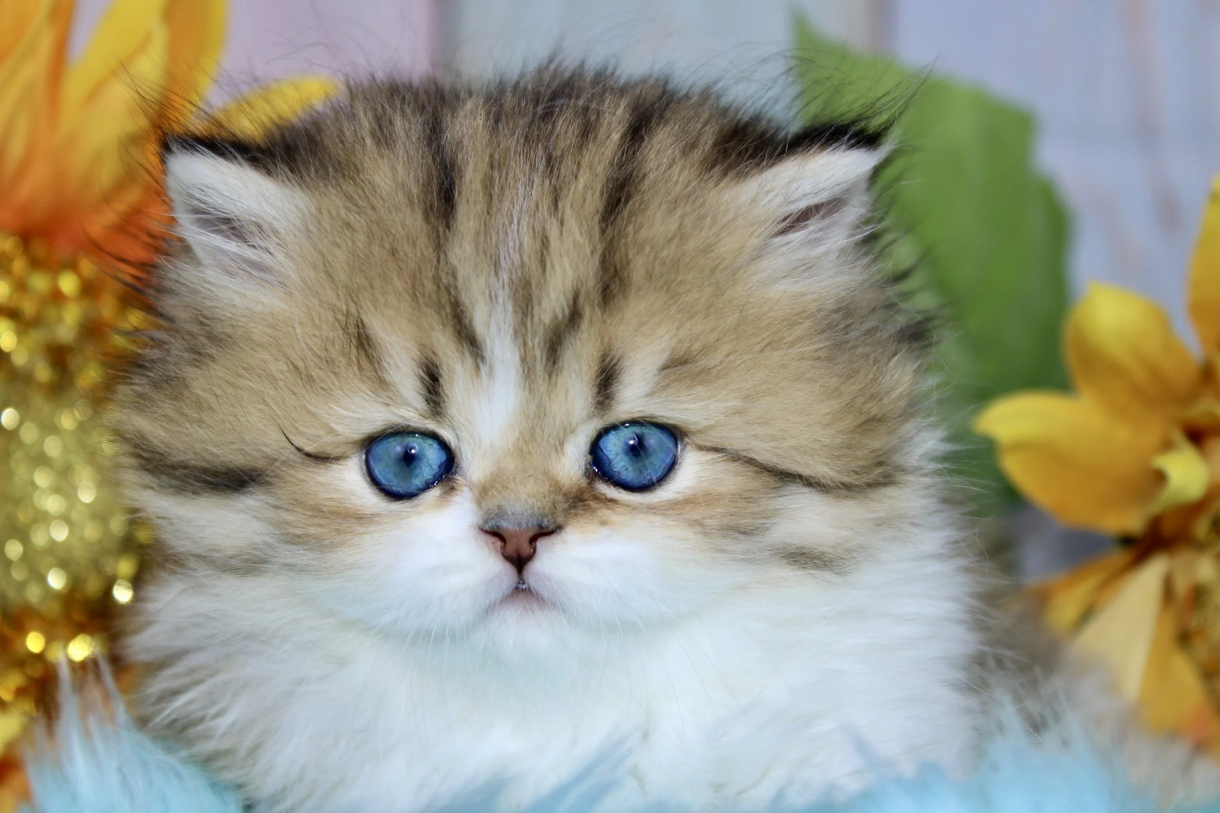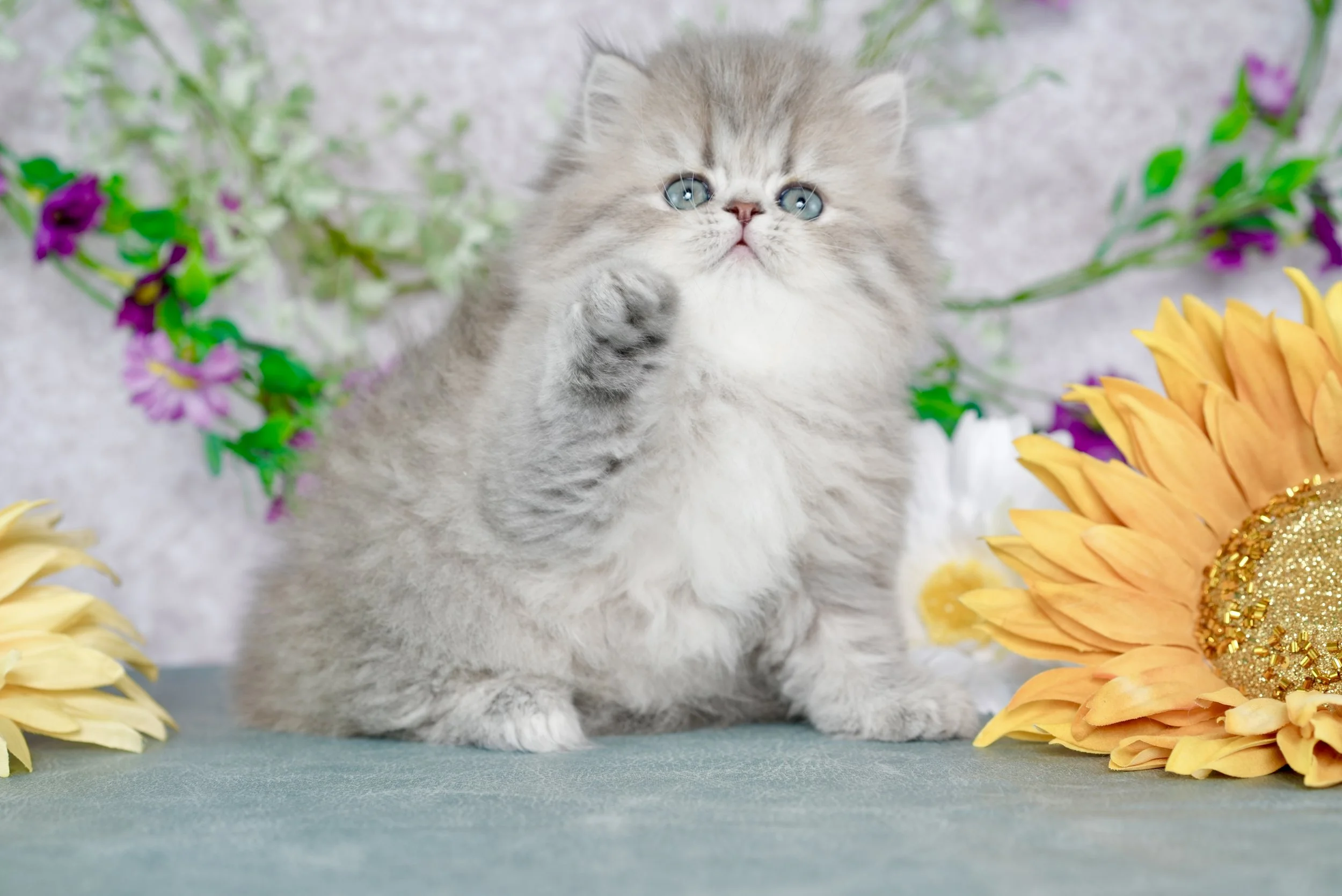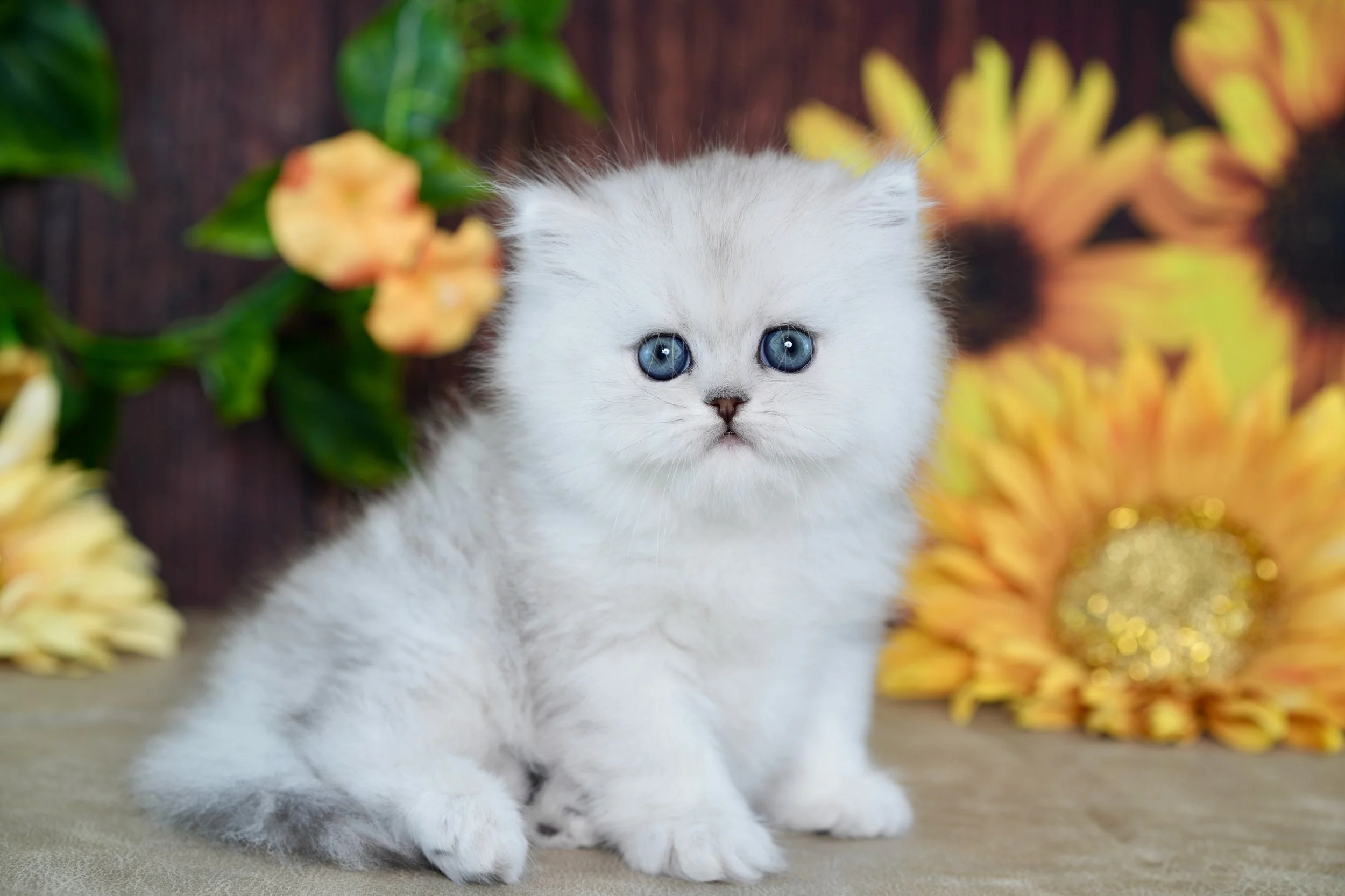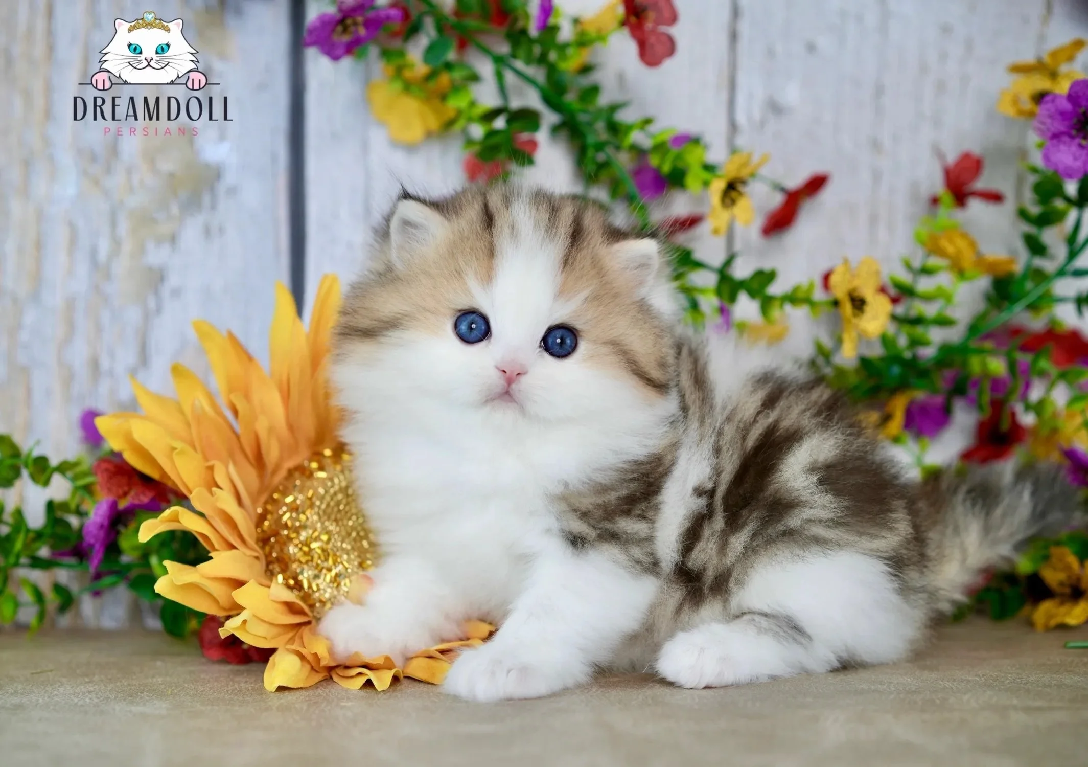 Fluffy kitten with blue eyes sitting in front of colorful flowers and a sunflower, background of a weathered white wooden wall.