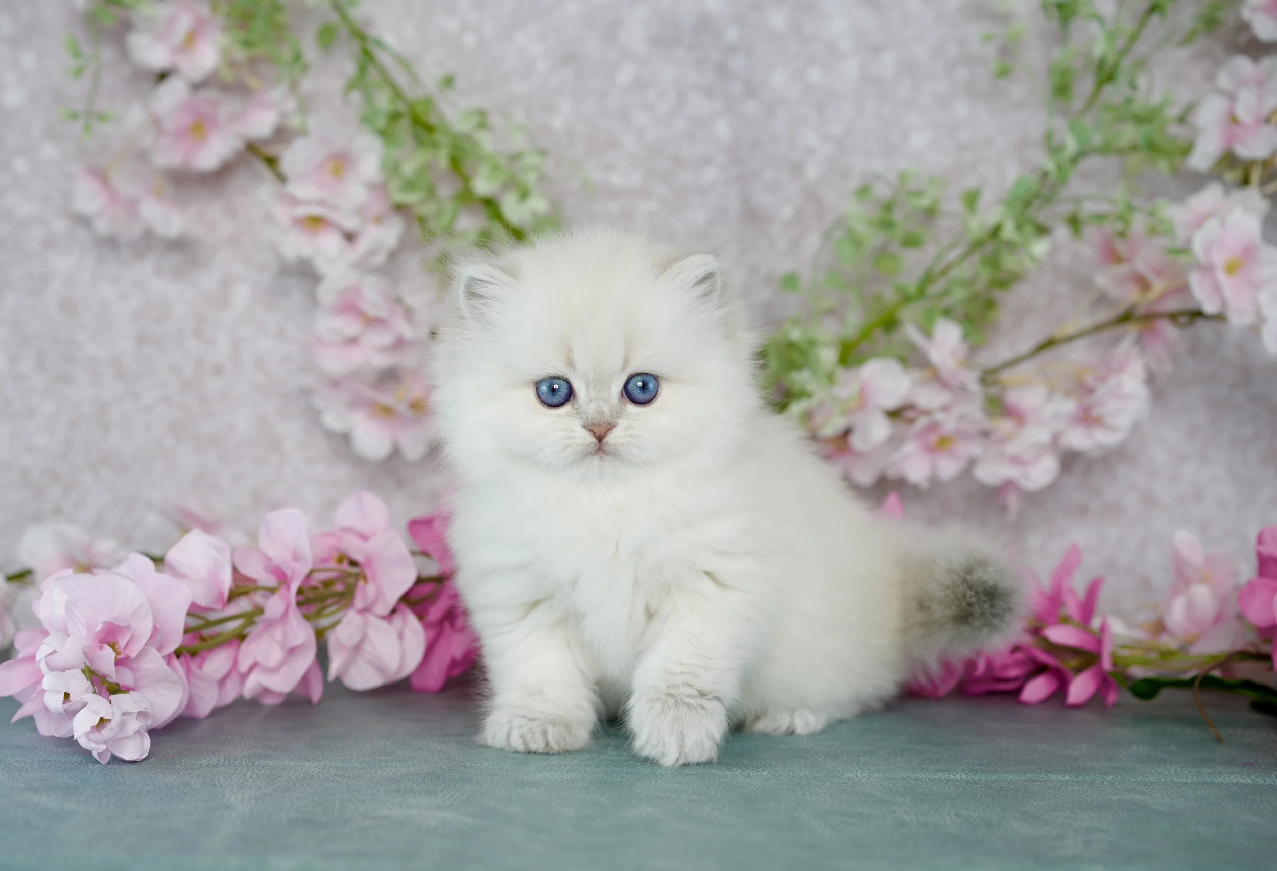 A white kitten with blue eyes, wearing a pearl necklace with a gold and red charm, is sitting on a surface surrounded by pink roses and greenery, with a blue background.