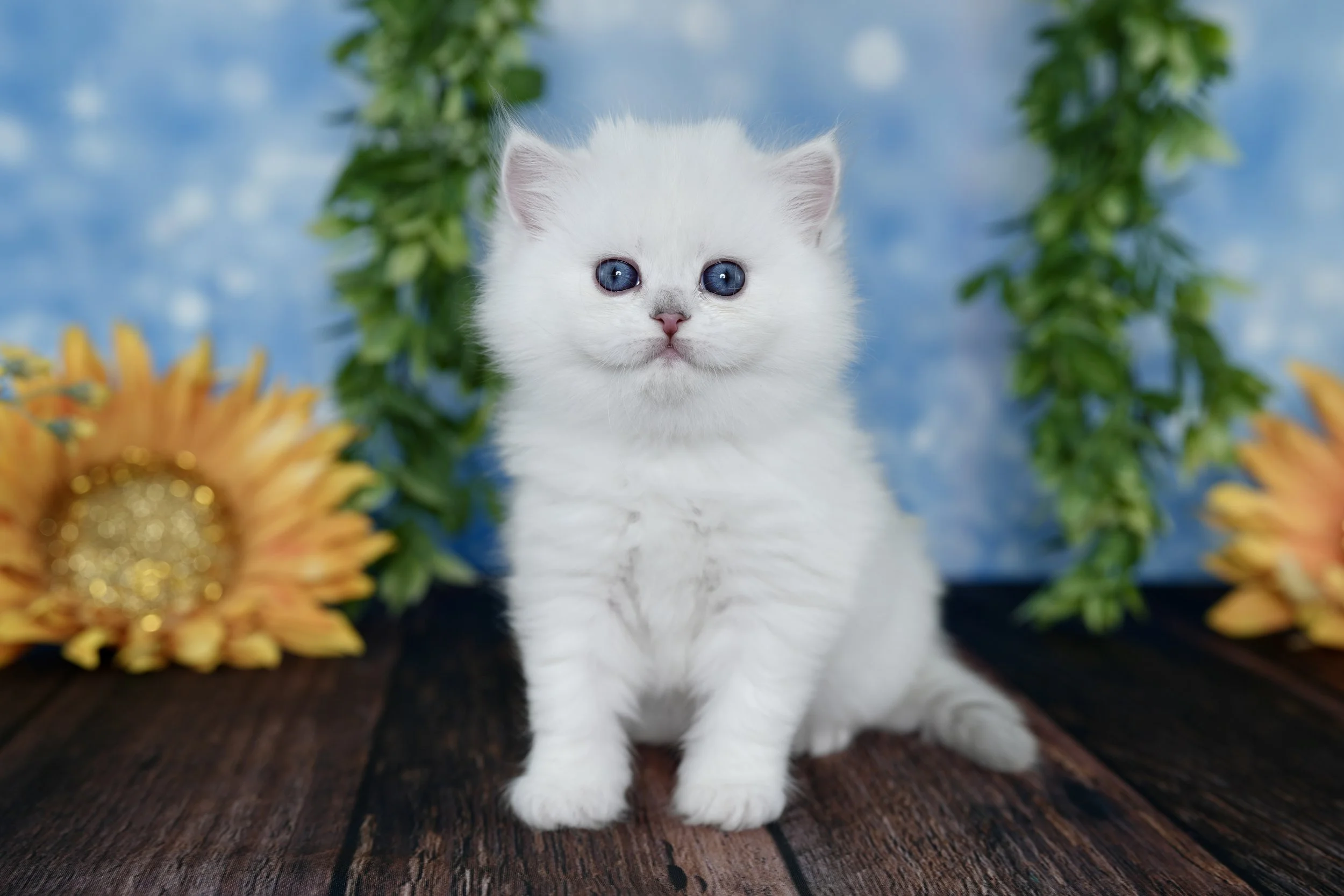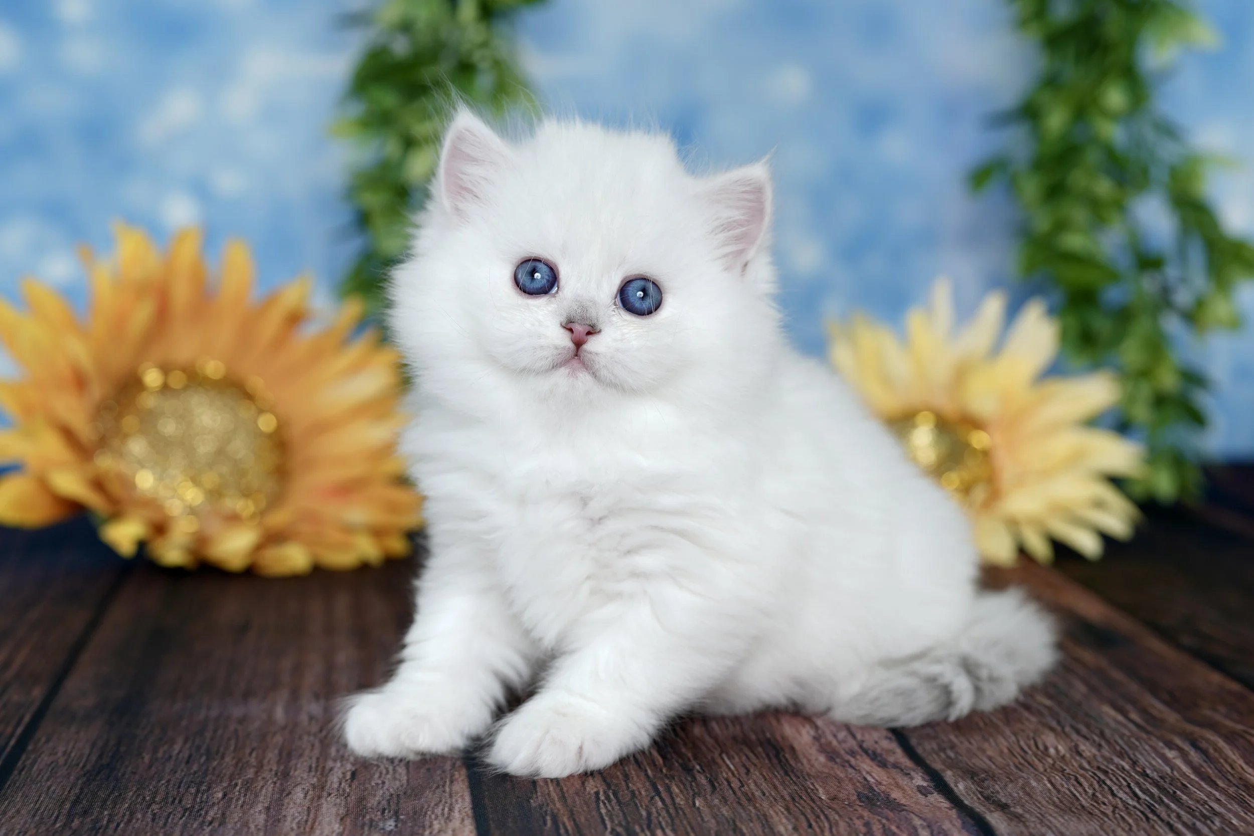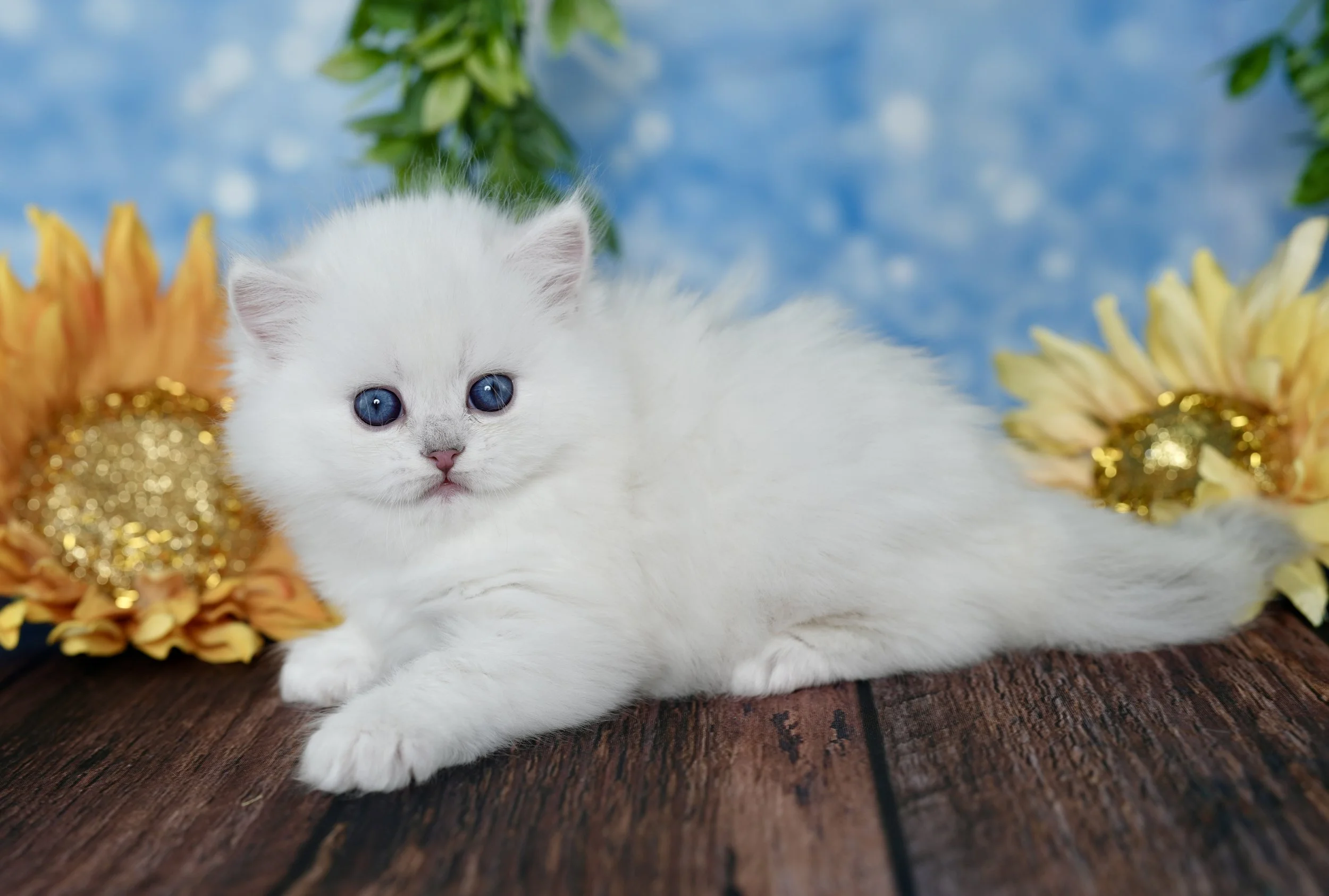 Meet ANGEL- Our breathtaking rare Silver Chinchilla Point female. She glows with an angelic white coat that looks like fresh snowfall, paired with the softest silver shading on her points. Her eyes are already a rich crystal blue, and will continue to deepen beautifully with age, becoming even more striking as she matures. She has the sweetest doll-face expression- round eyes, baby soft features and a calm, gentle, presence that melts into you when she’s held. If you’re looking for a truly special girl with exceptional beauty, rare coloring, and the nostalgia loving nature, Angel is an absolute dream. She is the kind of kitten who grows more magical by the day!