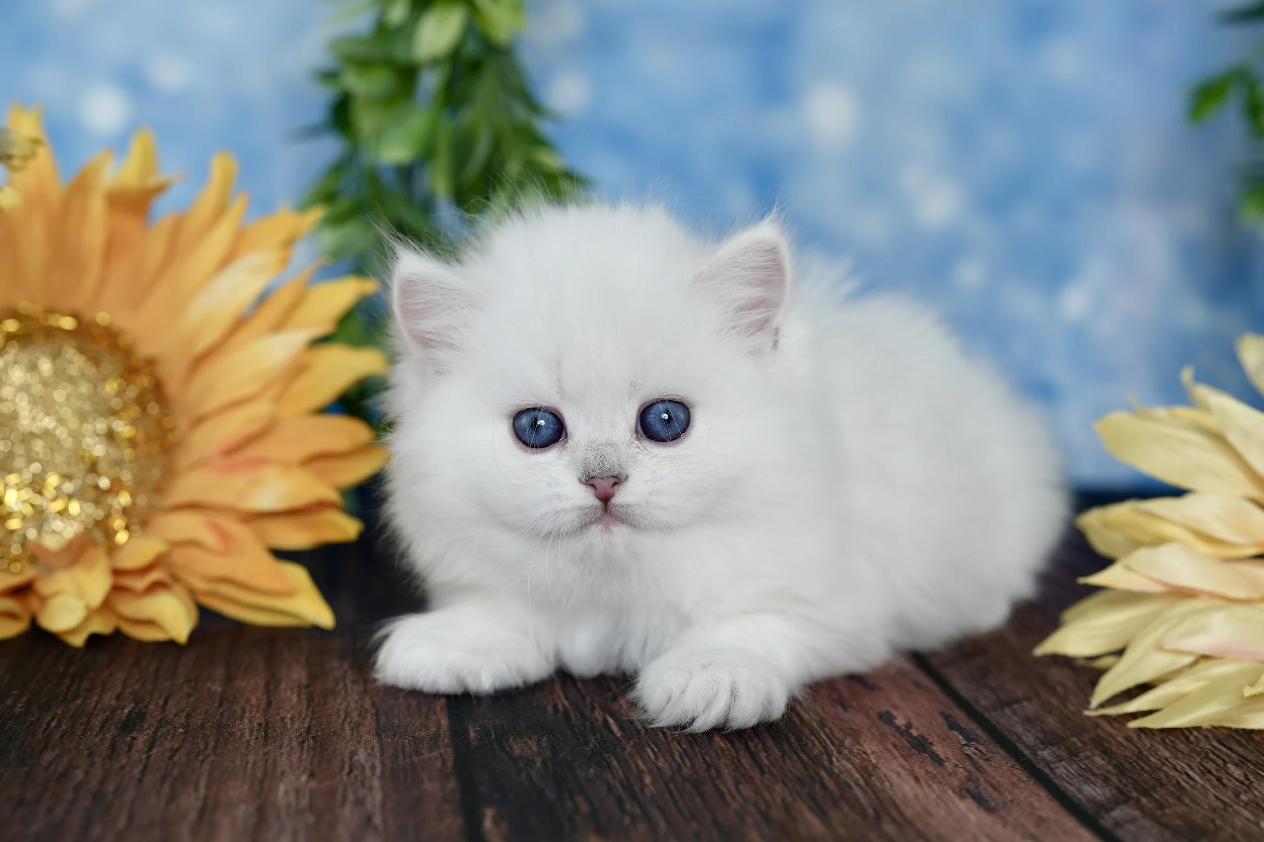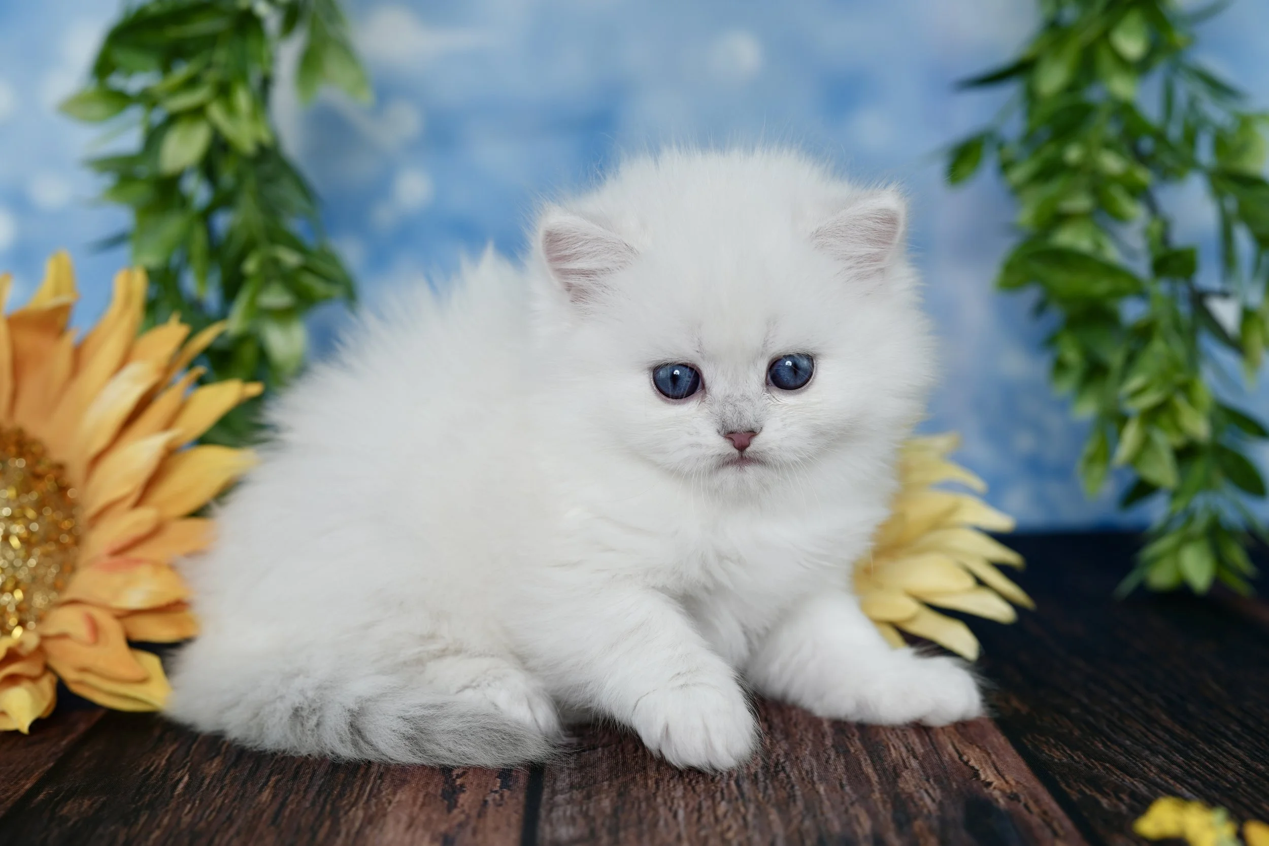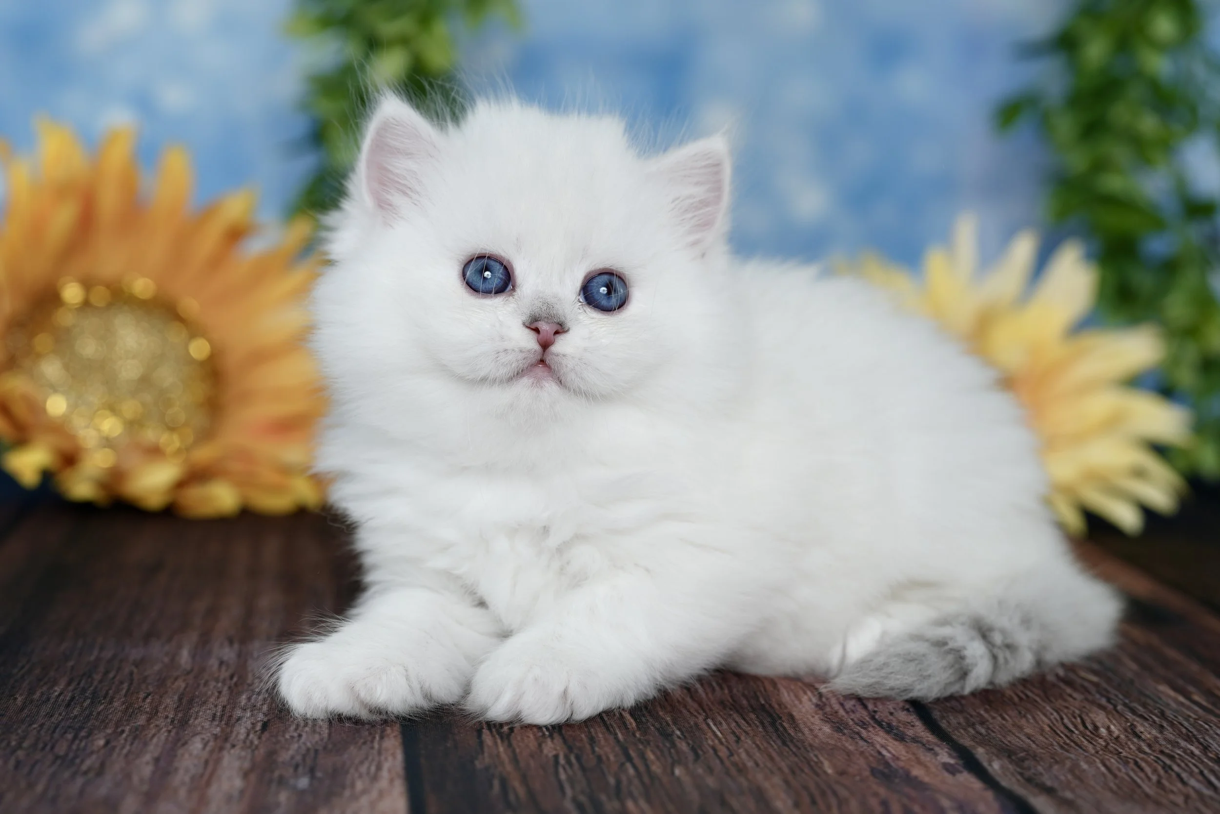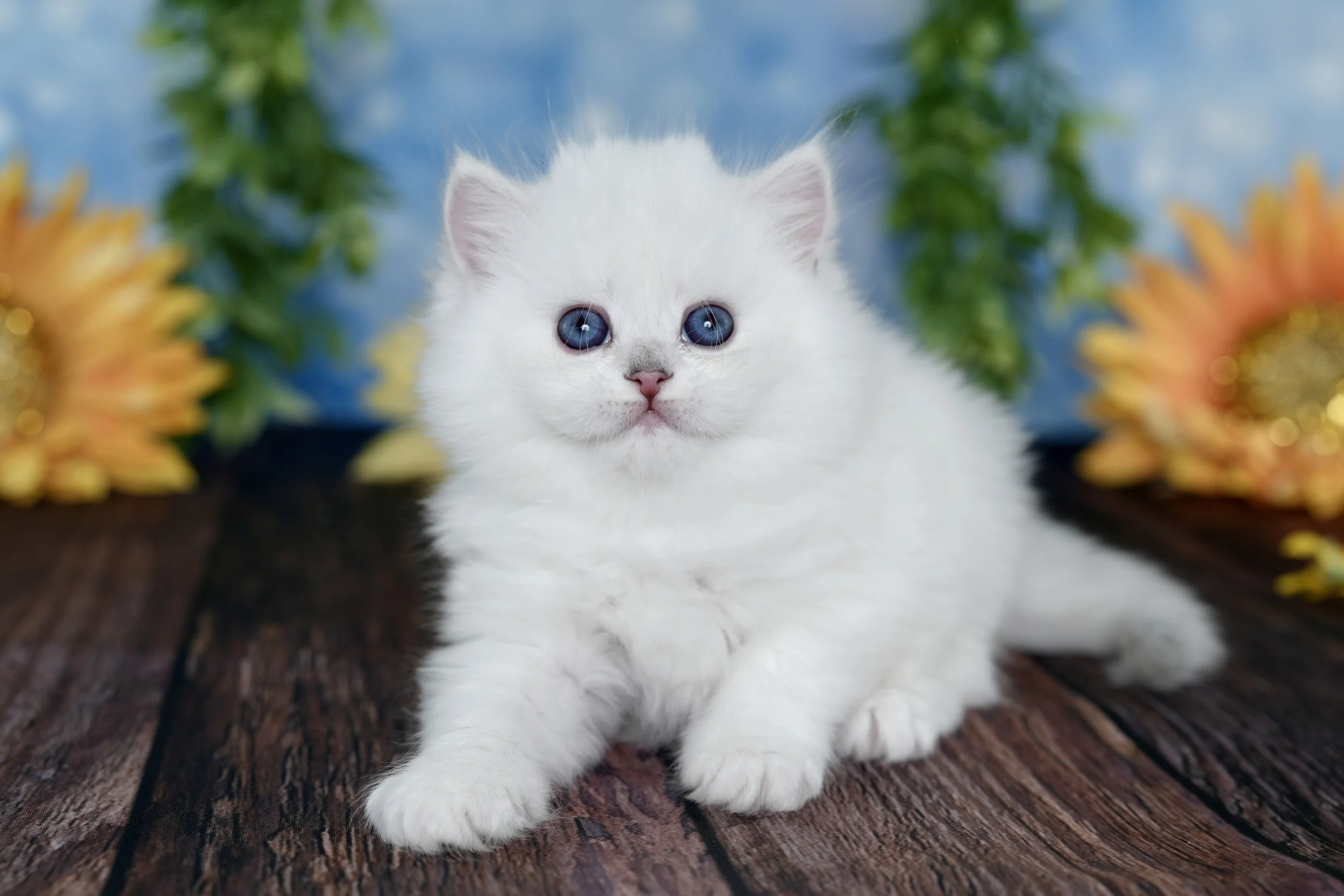 Meet ANGEL- Our breathtaking rare Silver Chinchilla Point female. She glows with an angelic white coat that looks like fresh snowfall, paired with the softest silver shading on her points. Her eyes are already a rich crystal blue, and will continue to deepen beautifully with age, becoming even more striking as she matures. She has the sweetest doll-face expression- round eyes, baby soft features and a calm, gentle, presence that melts into you when she’s held. If you’re looking for a truly special girl with exceptional beauty, rare coloring, and the nostalgia loving nature, Angel is an absolute dream. She is the kind of kitten who grows more magical by the day!