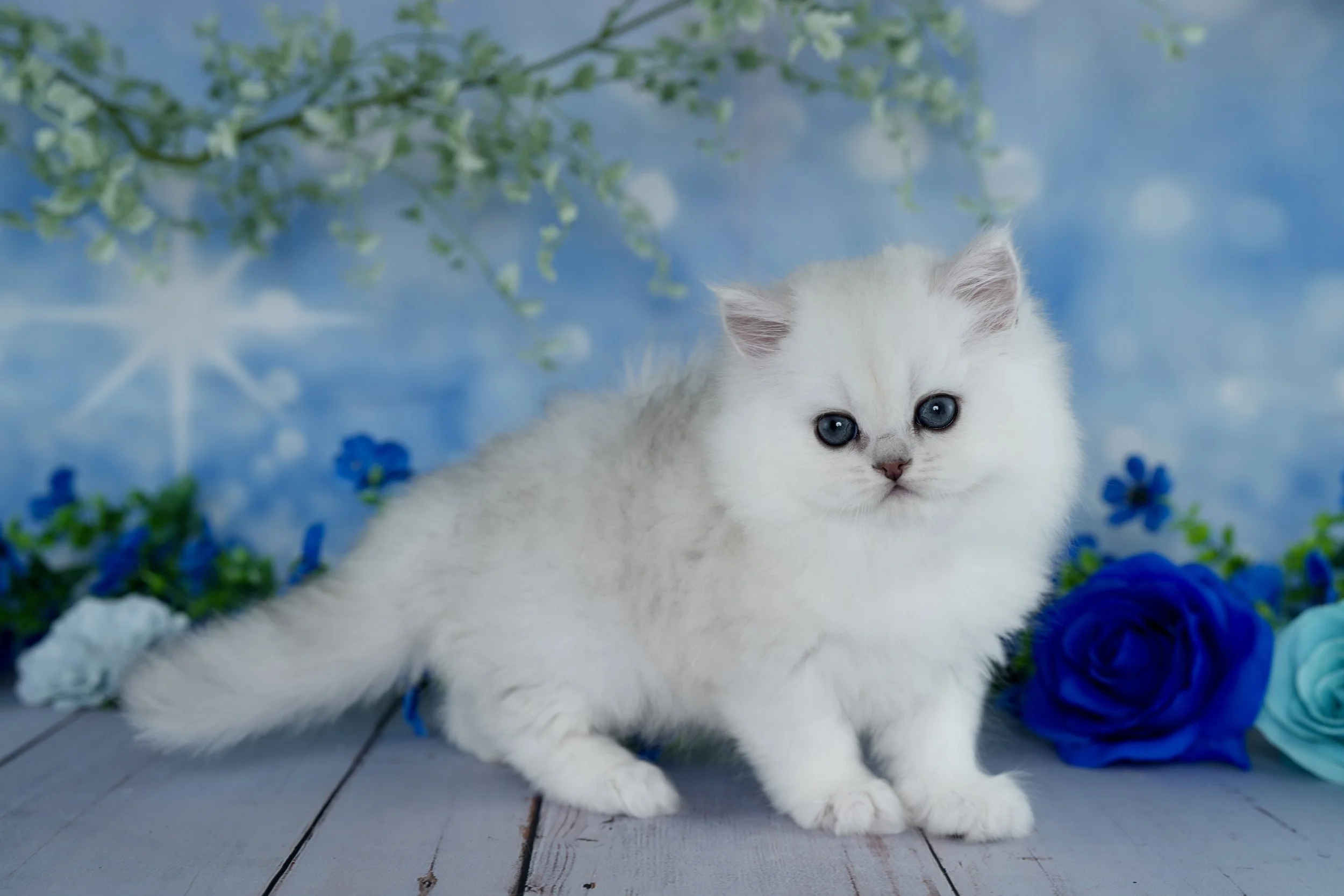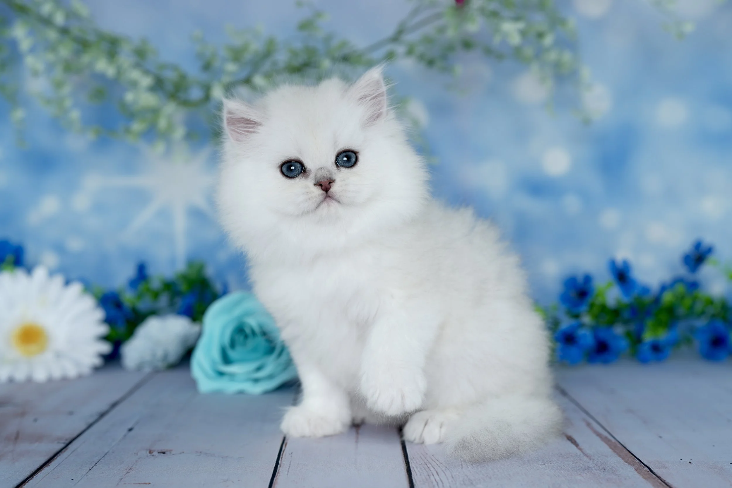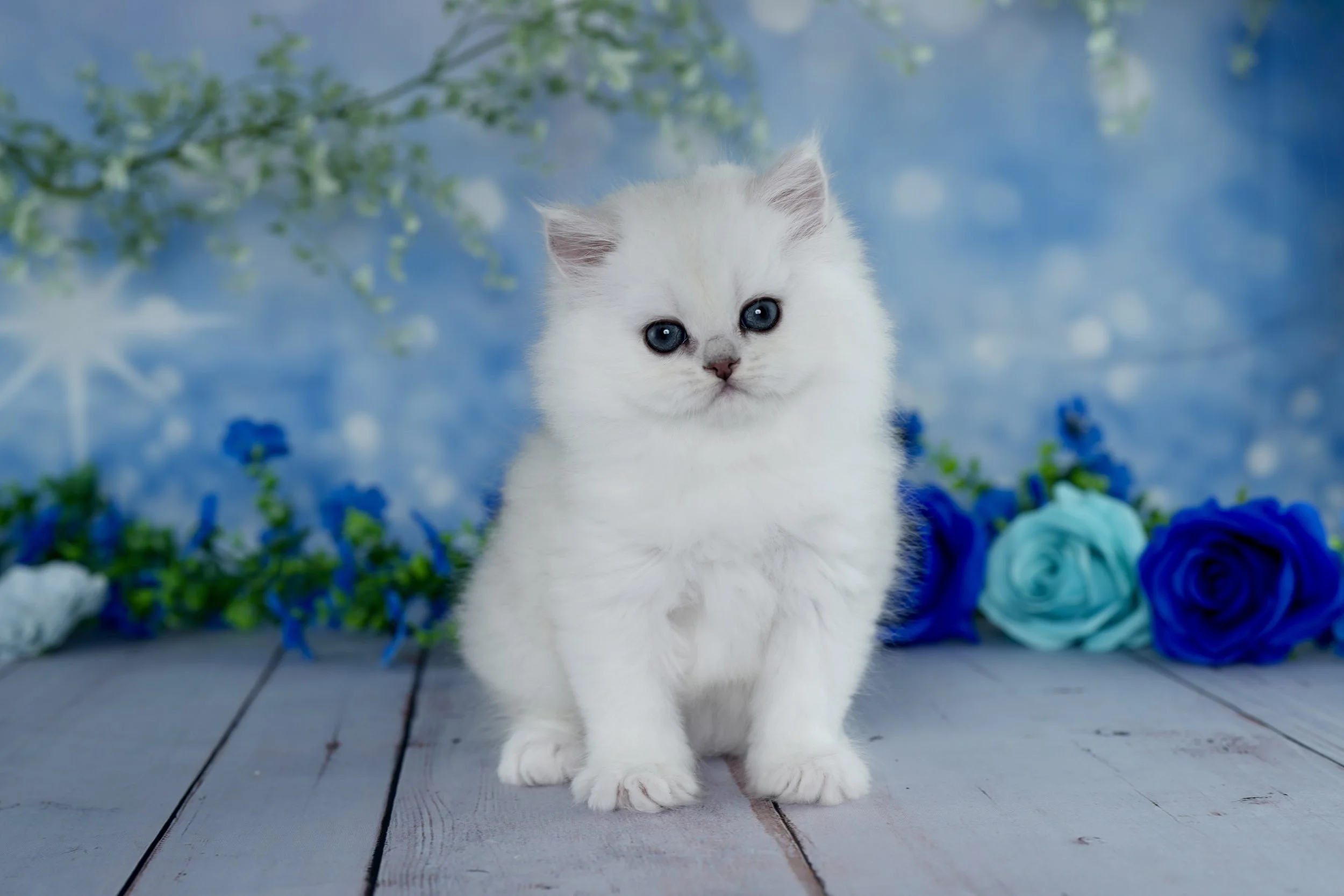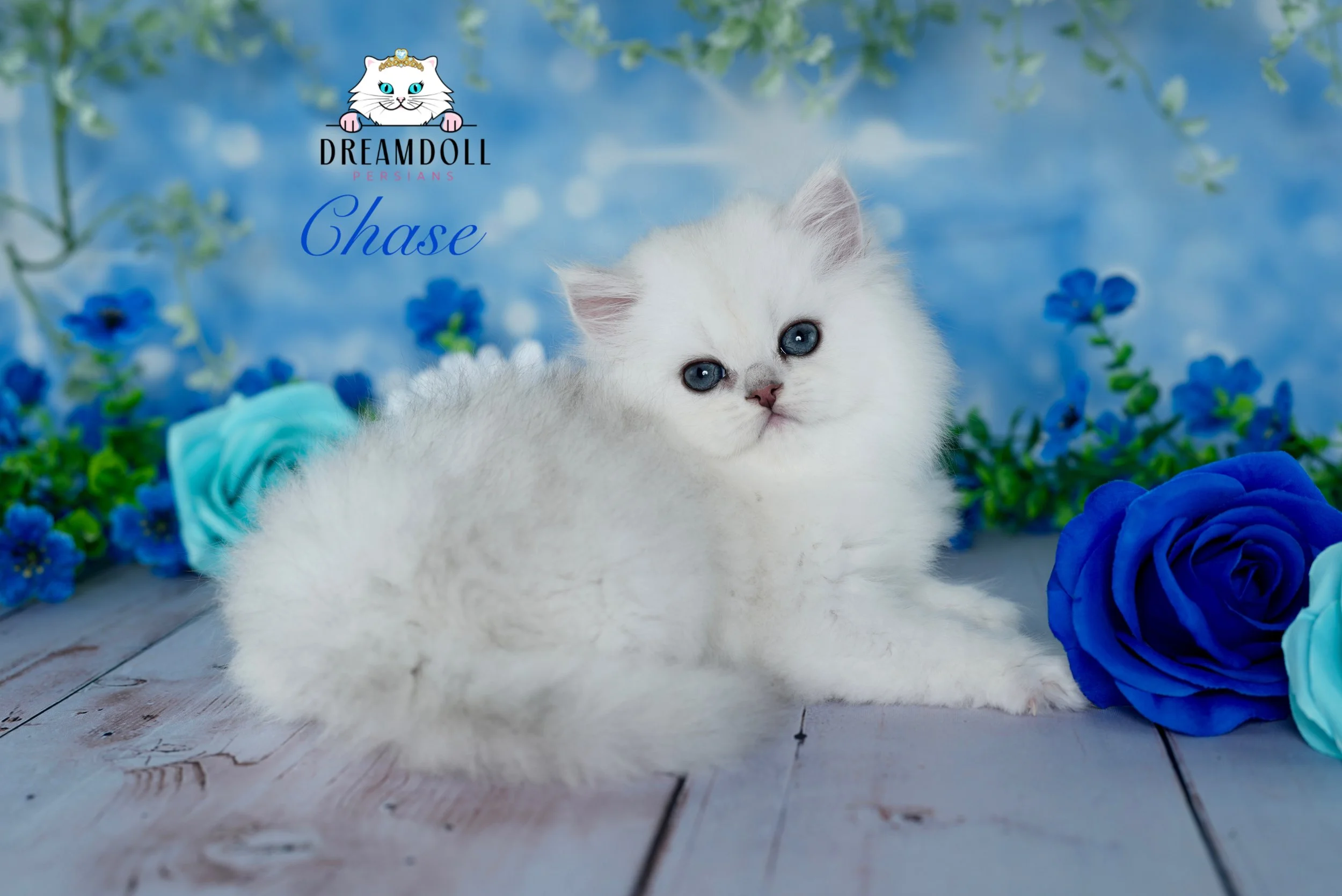 Meet CHASE - This breathtaking boy is pure snow-soft perfection. Chase has an angelic doll face with luminous sapphire eyes that glimmer like clear morning skies. His coat is a pristine, silvery white misted with the faintest silver sparkle, unique to high quality silver persians. He is a gentle, affectionate baby who loves to pose for attention. He will mature into a full coated persian with ethereal, fairytale look embodies the Dreamdoll standard.
