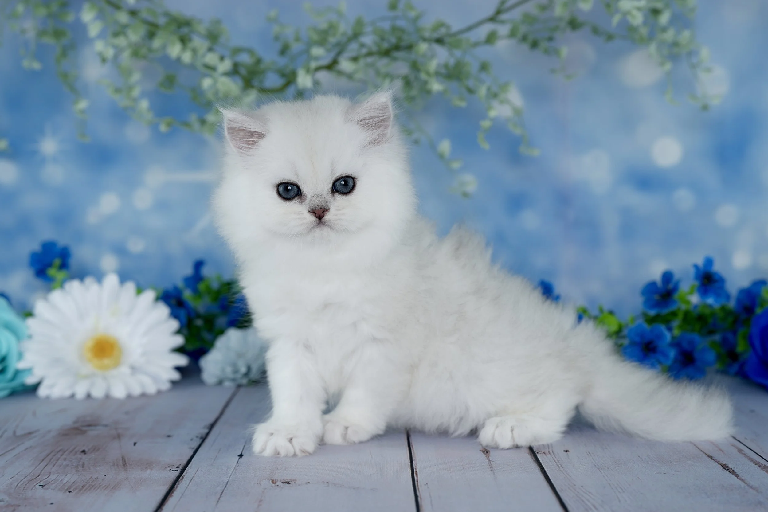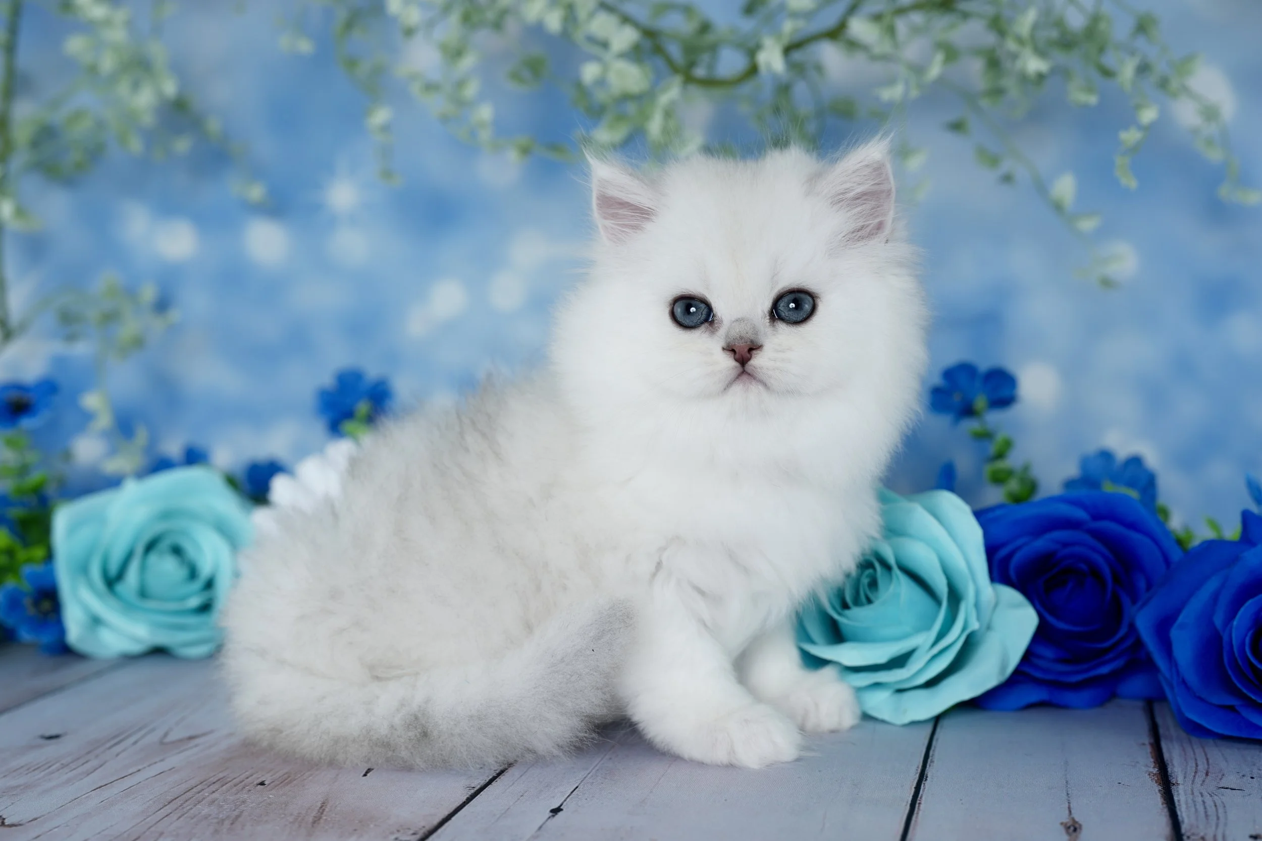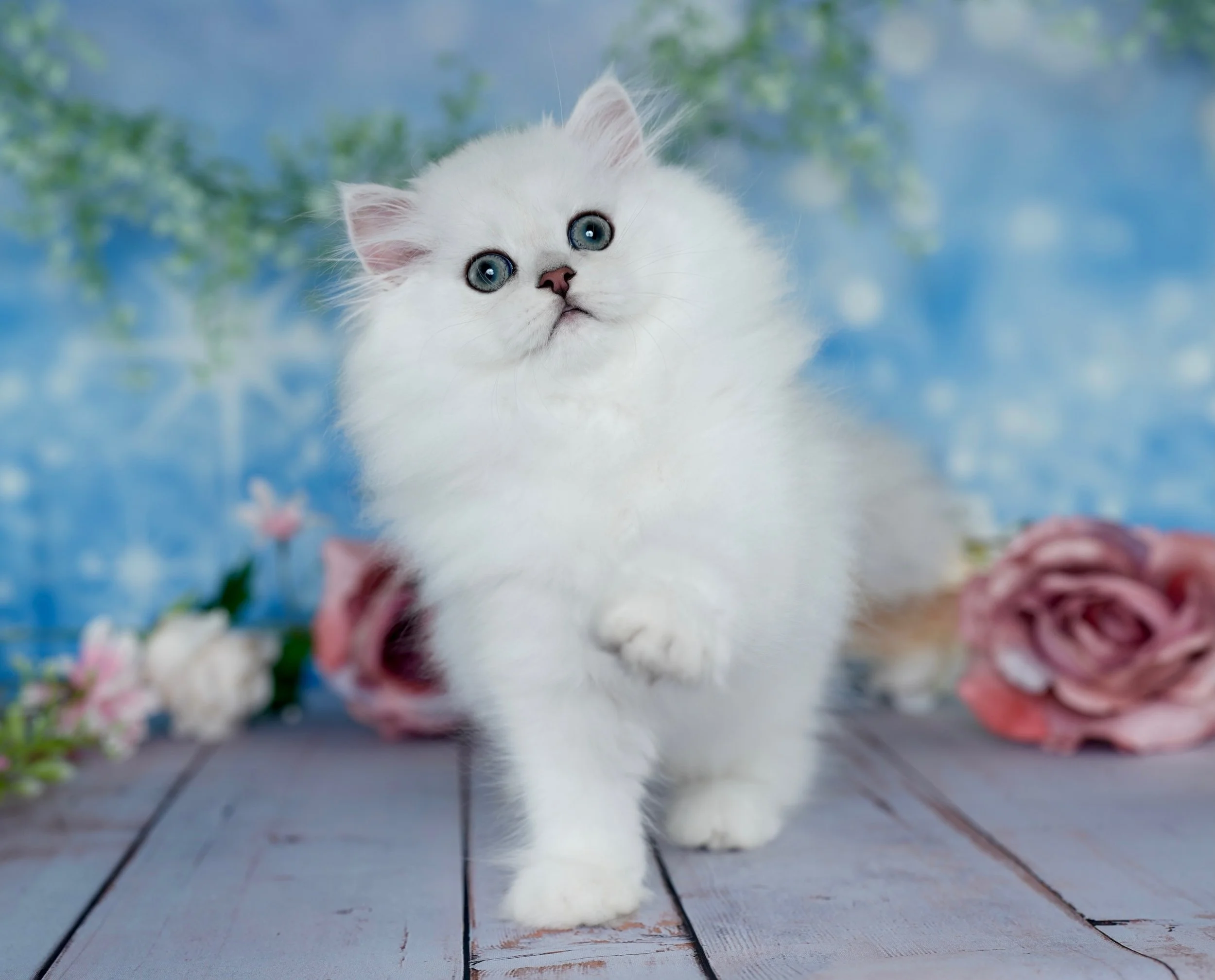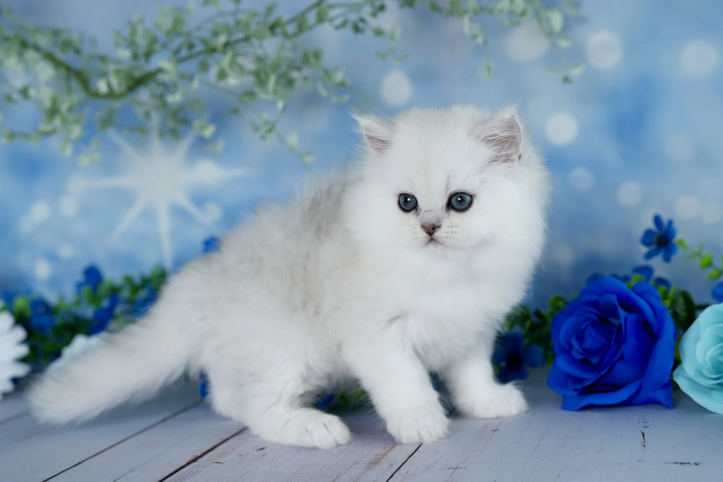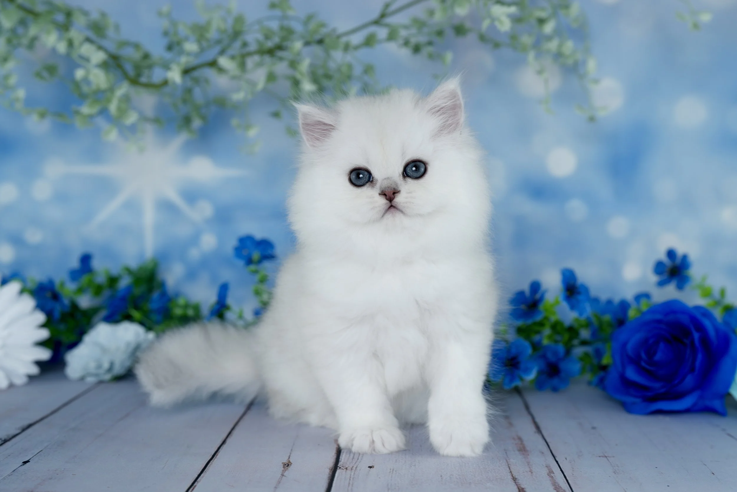 Meet CHASE - This breathtaking boy is pure snow-soft perfection. Chase has an angelic doll face with luminous sapphire eyes that glimmer like clear morning skies. His coat is a pristine, silvery white misted with the faintest silver sparkle, unique to high quality silver persians. He is a gentle, affectionate baby who loves to pose for attention. He will mature into a full coated persian with ethereal, fairytale look embodies the Dreamdoll standard.