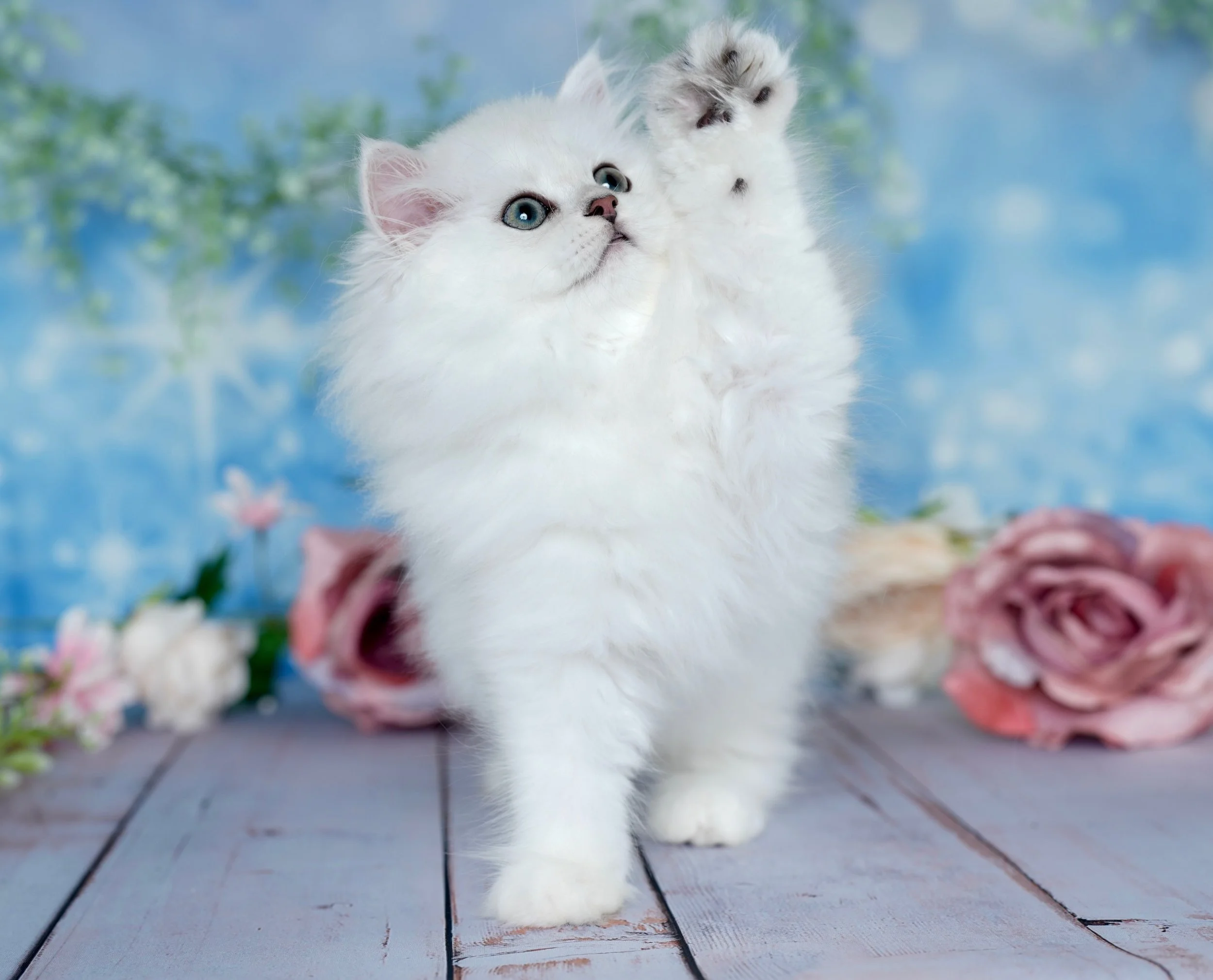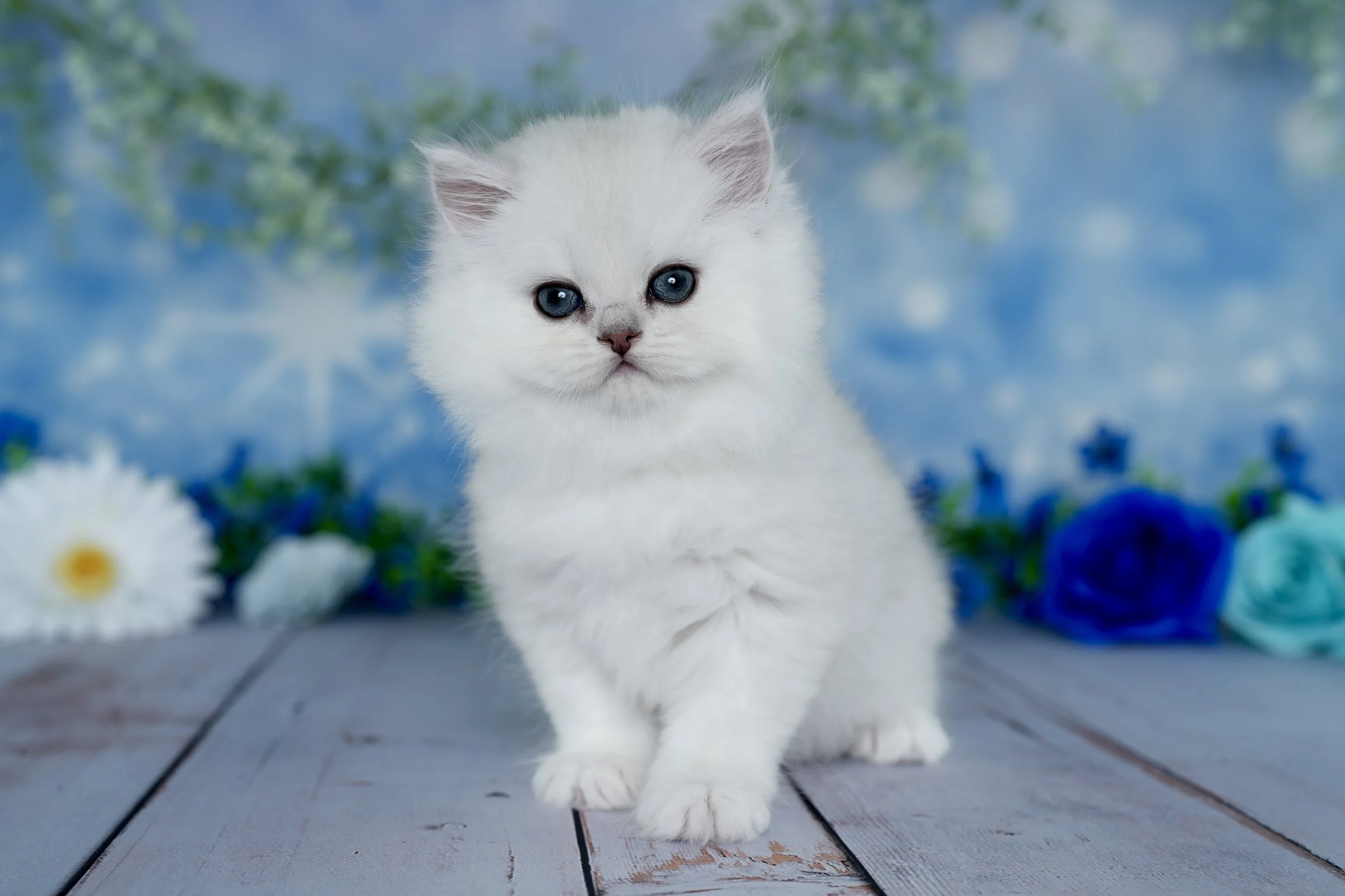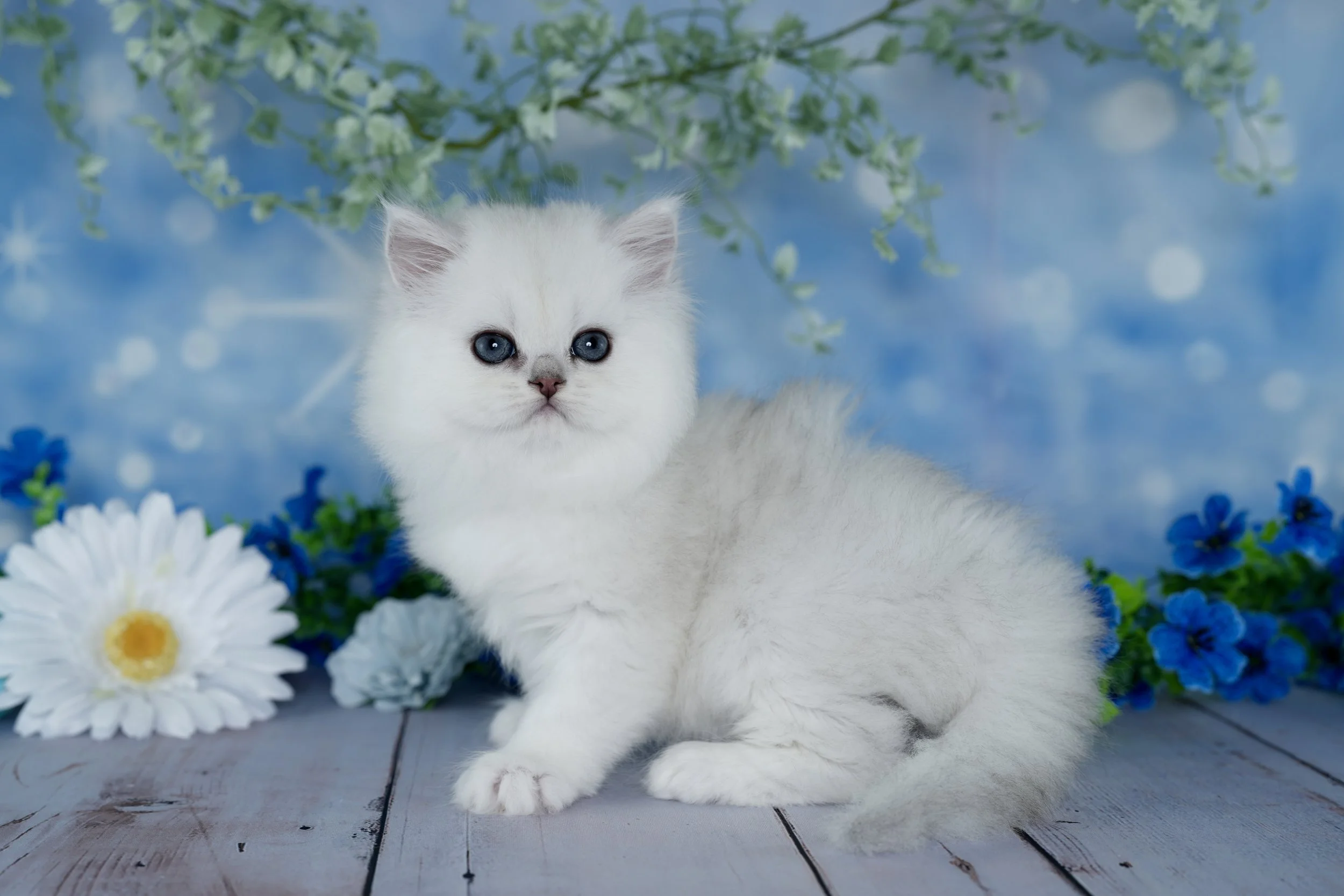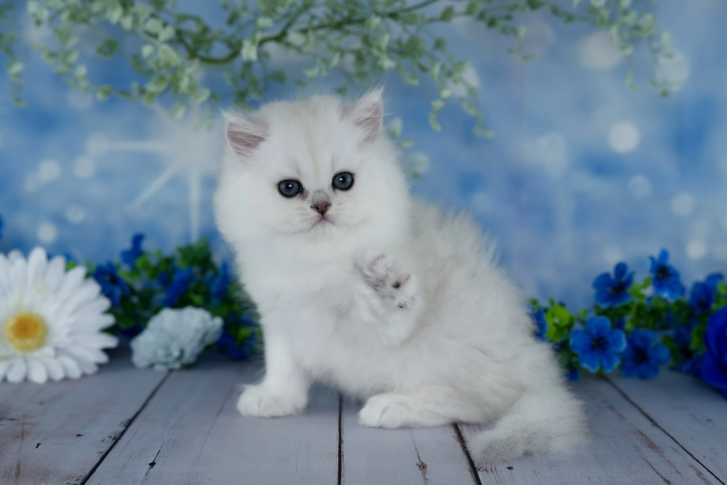 Meet CHASE - This breathtaking boy is pure snow-soft perfection. Chase has an angelic doll face with luminous sapphire eyes that glimmer like clear morning skies. His coat is a pristine, silvery white misted with the faintest silver sparkle, unique to high quality silver persians. He is a gentle, affectionate baby who loves to pose for attention. He will mature into a full coated persian with ethereal, fairytale look embodies the Dreamdoll standard.