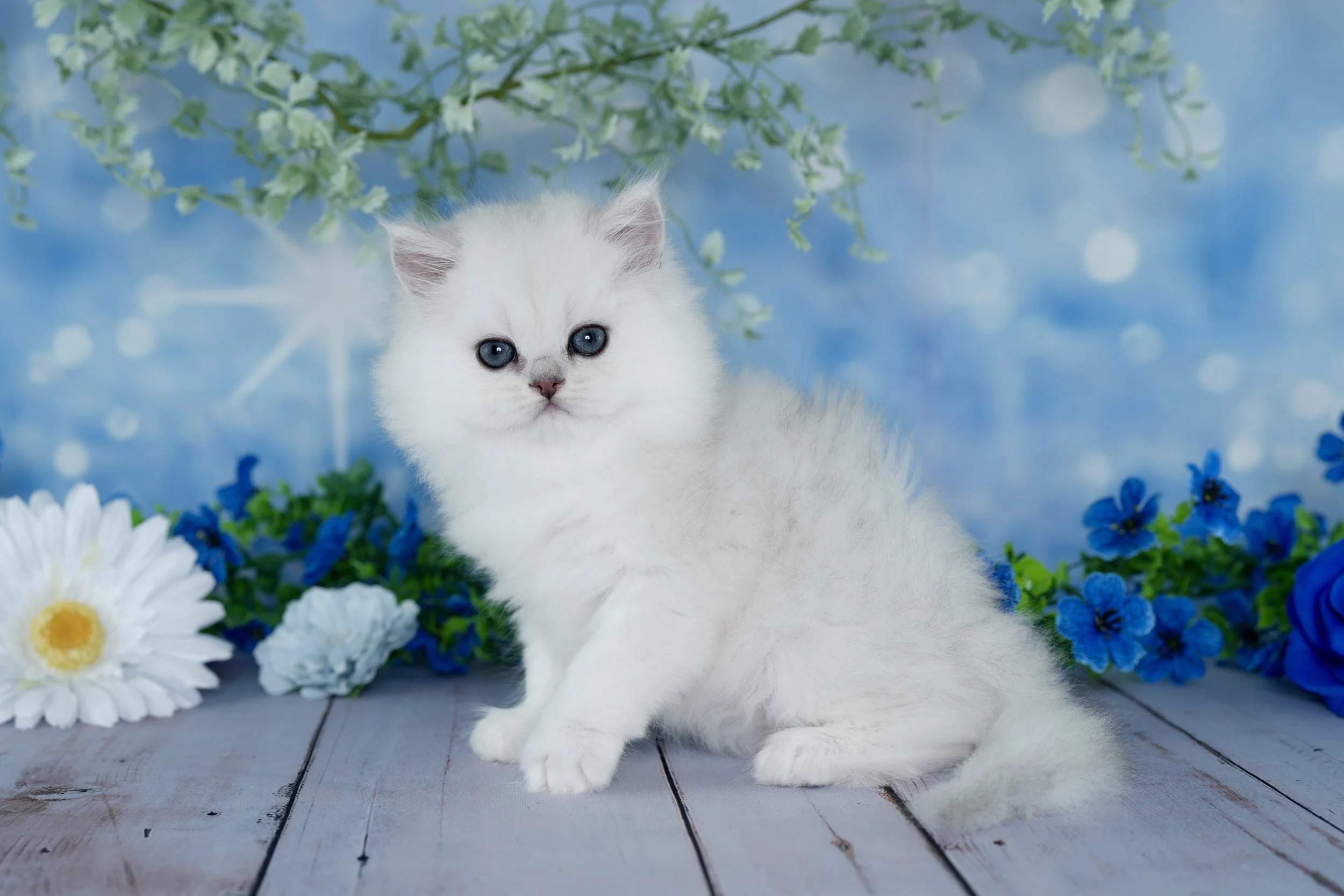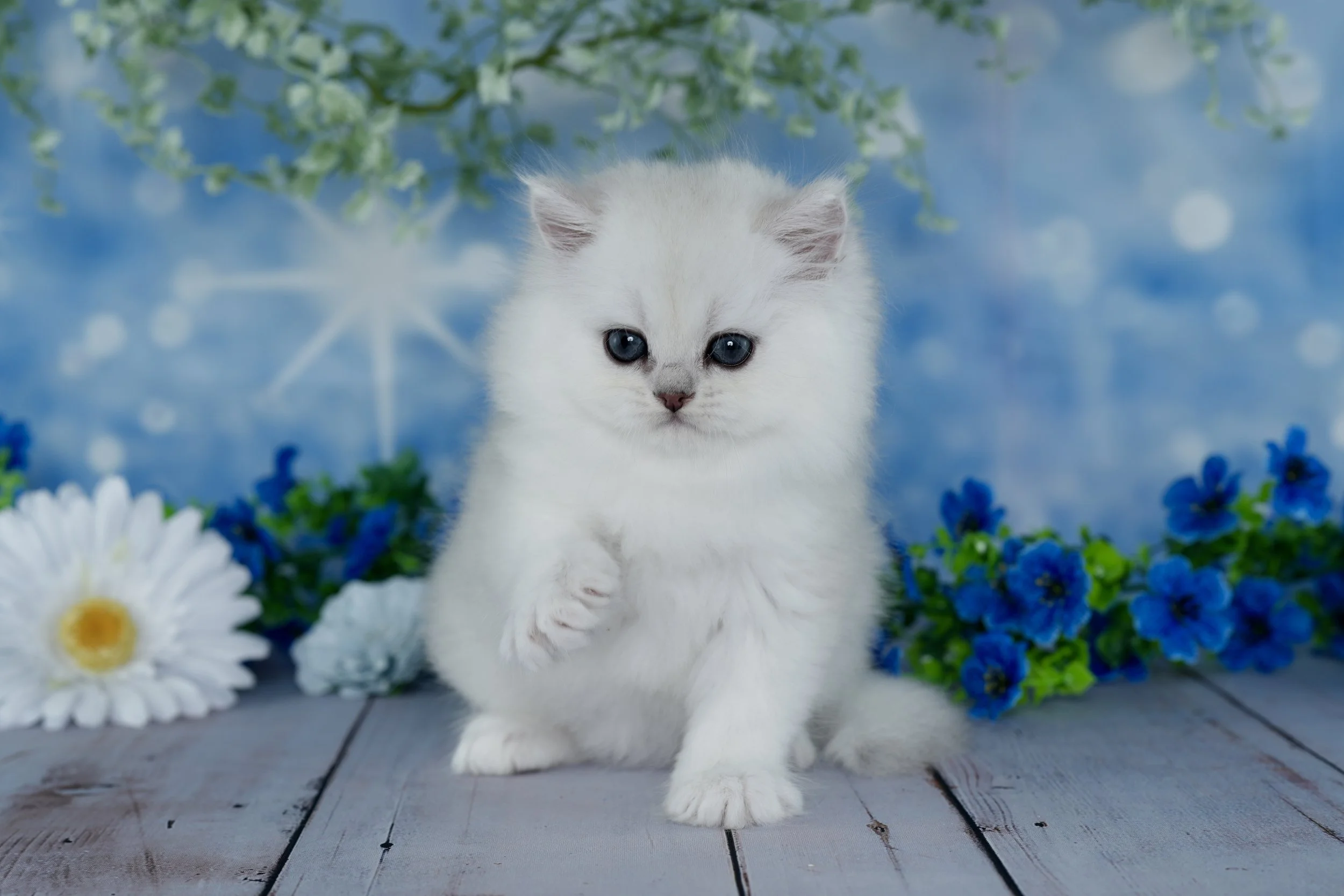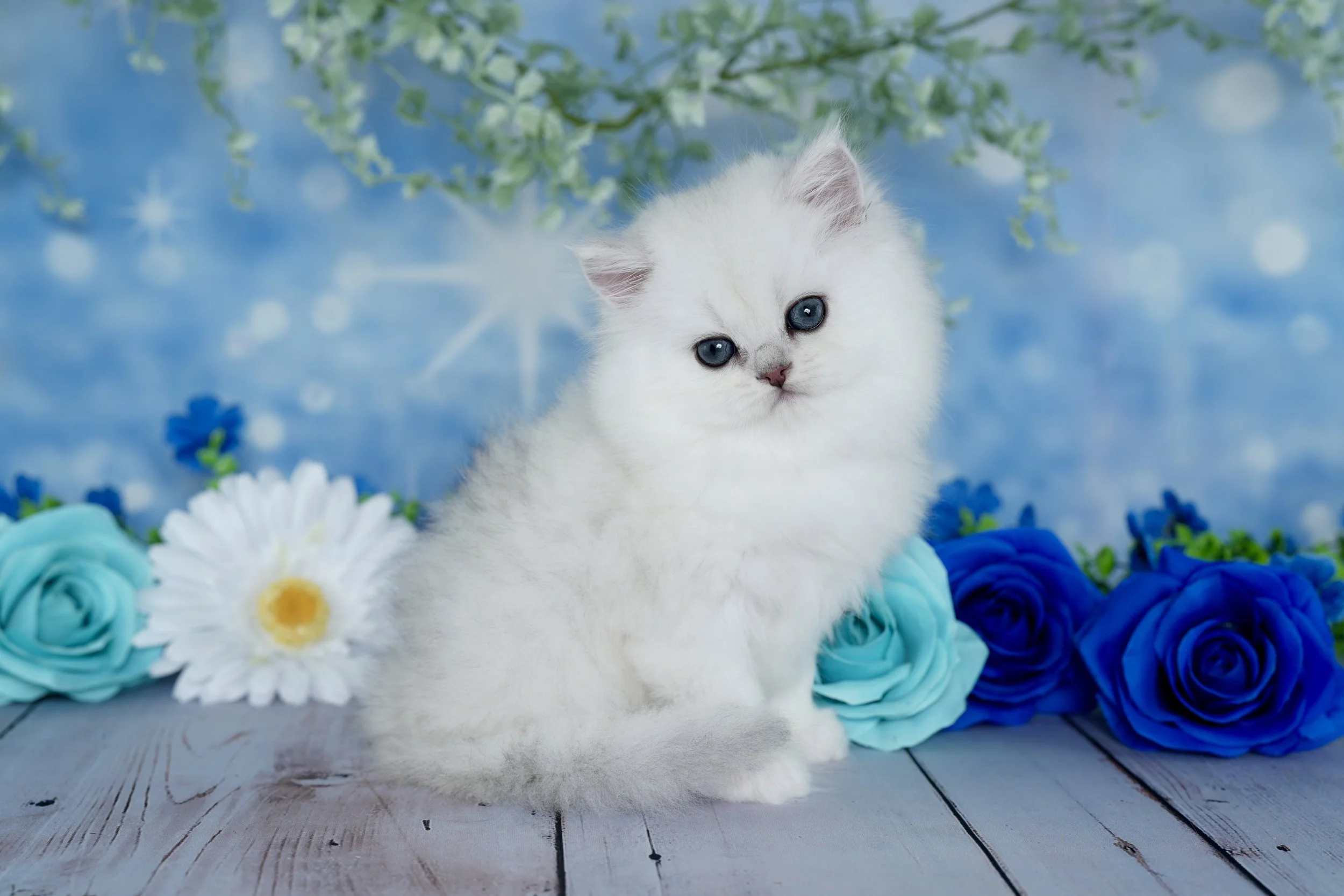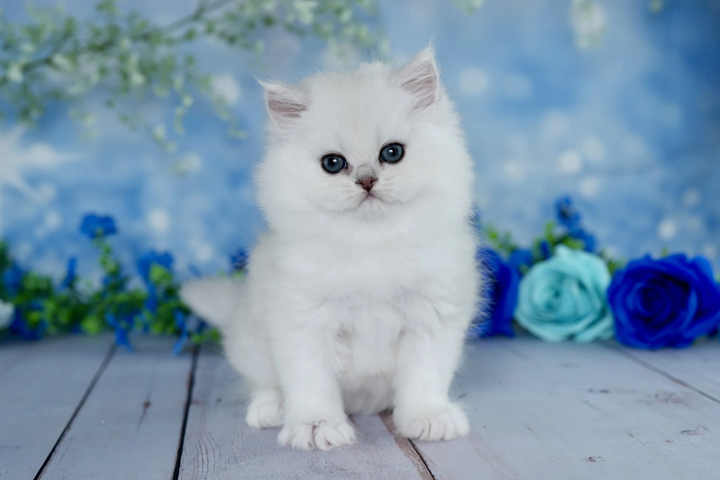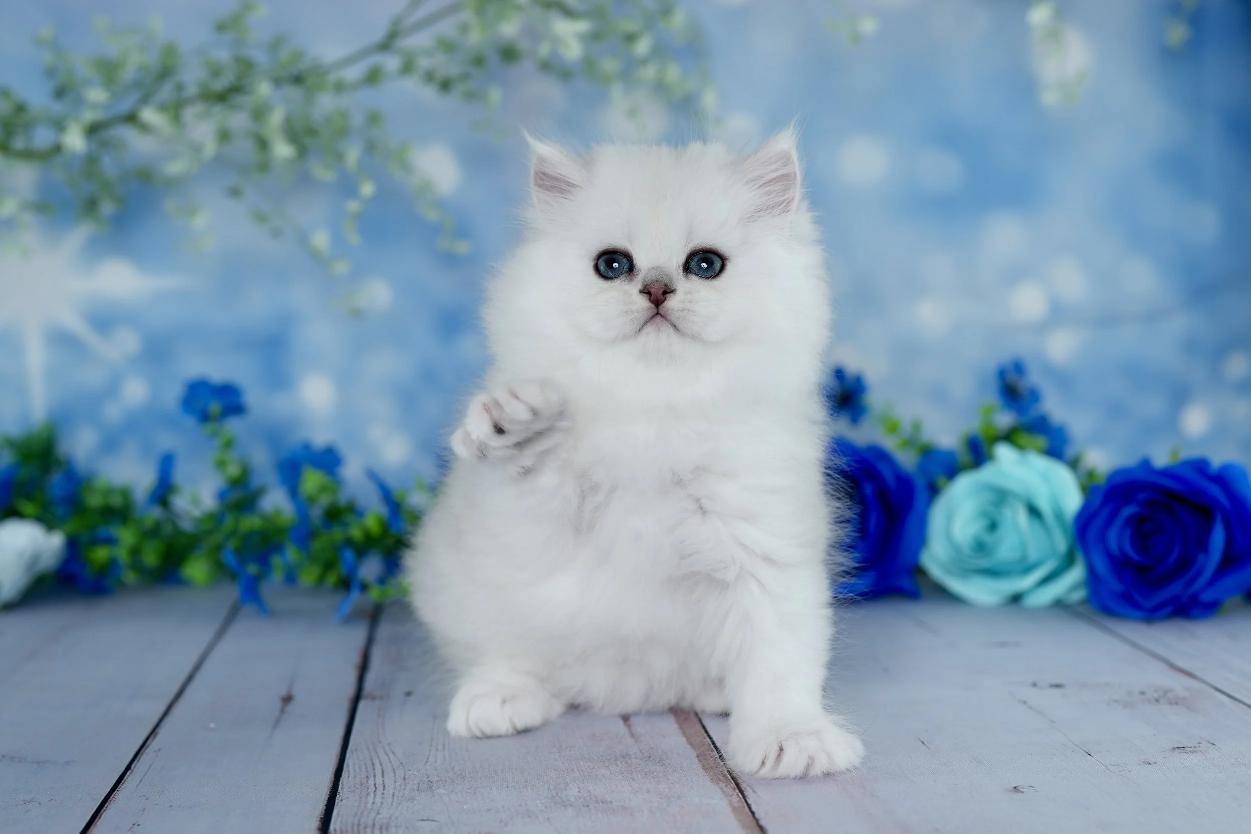 Meet CHASE - This breathtaking boy is pure snow-soft perfection. Chase has an angelic doll face with luminous sapphire eyes that glimmer like clear morning skies. His coat is a pristine, silvery white misted with the faintest silver sparkle, unique to high quality silver persians. He is a gentle, affectionate baby who loves to pose for attention. He will mature into a full coated persian with ethereal, fairytale look embodies the Dreamdoll standard.