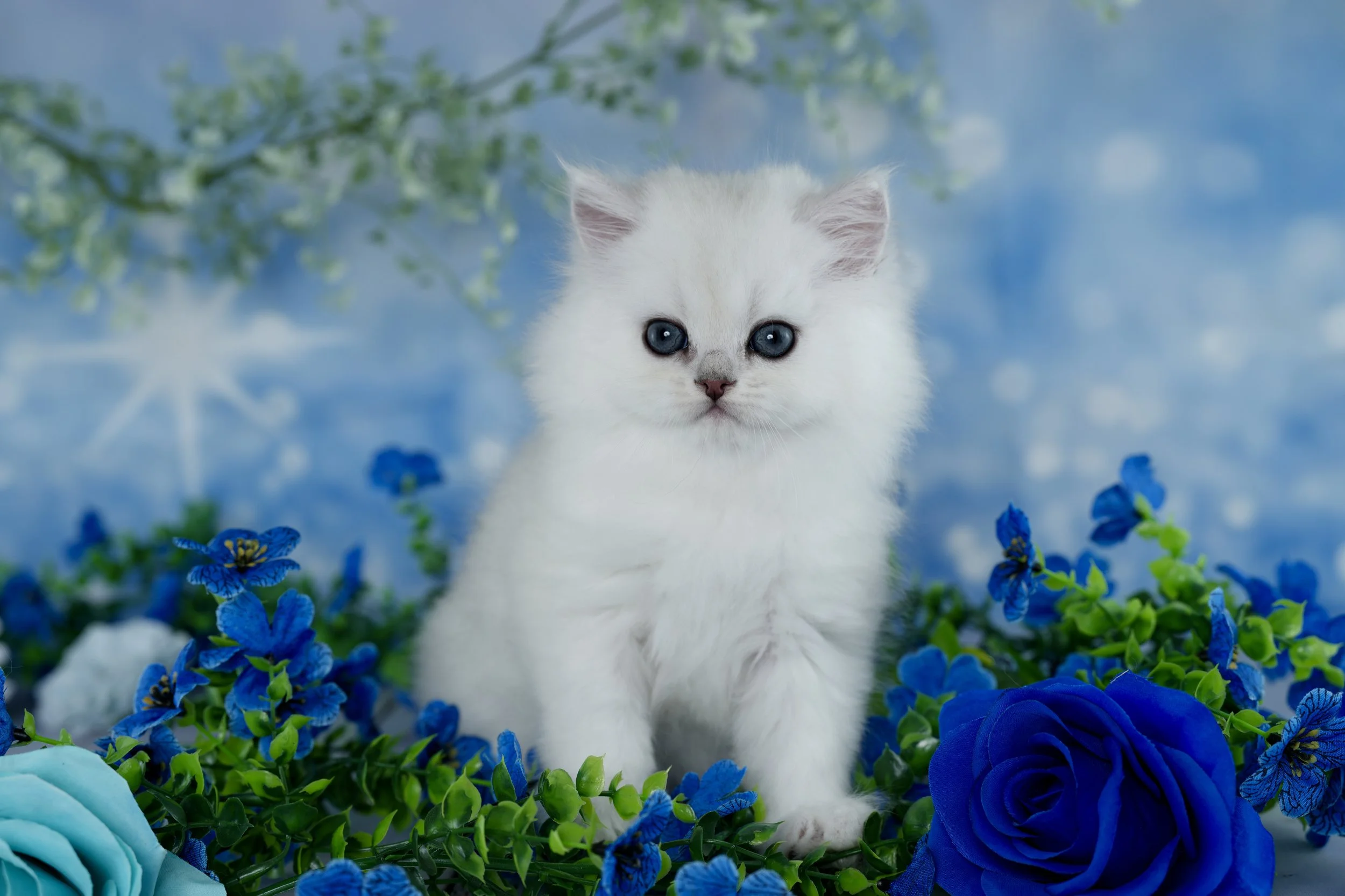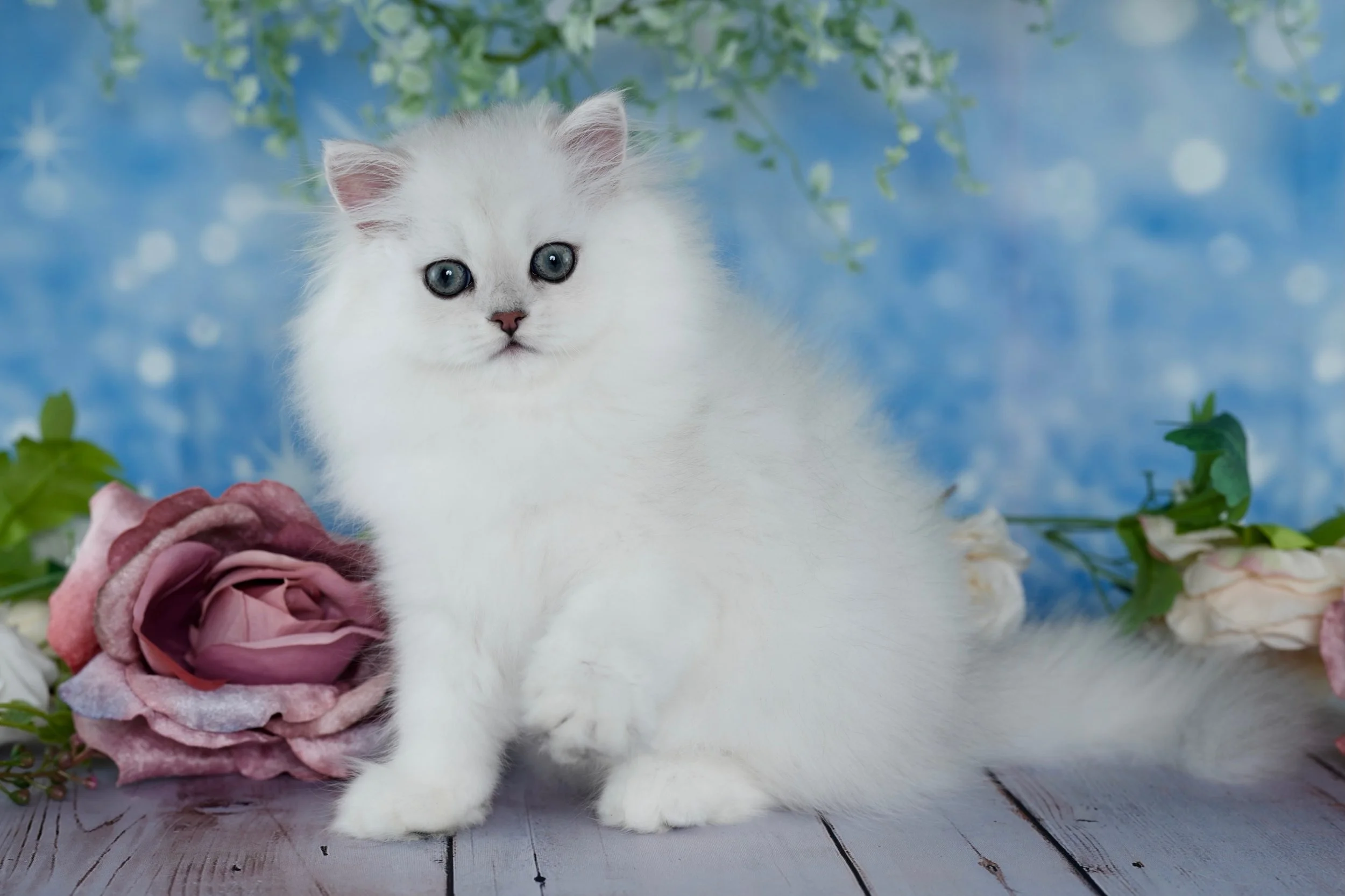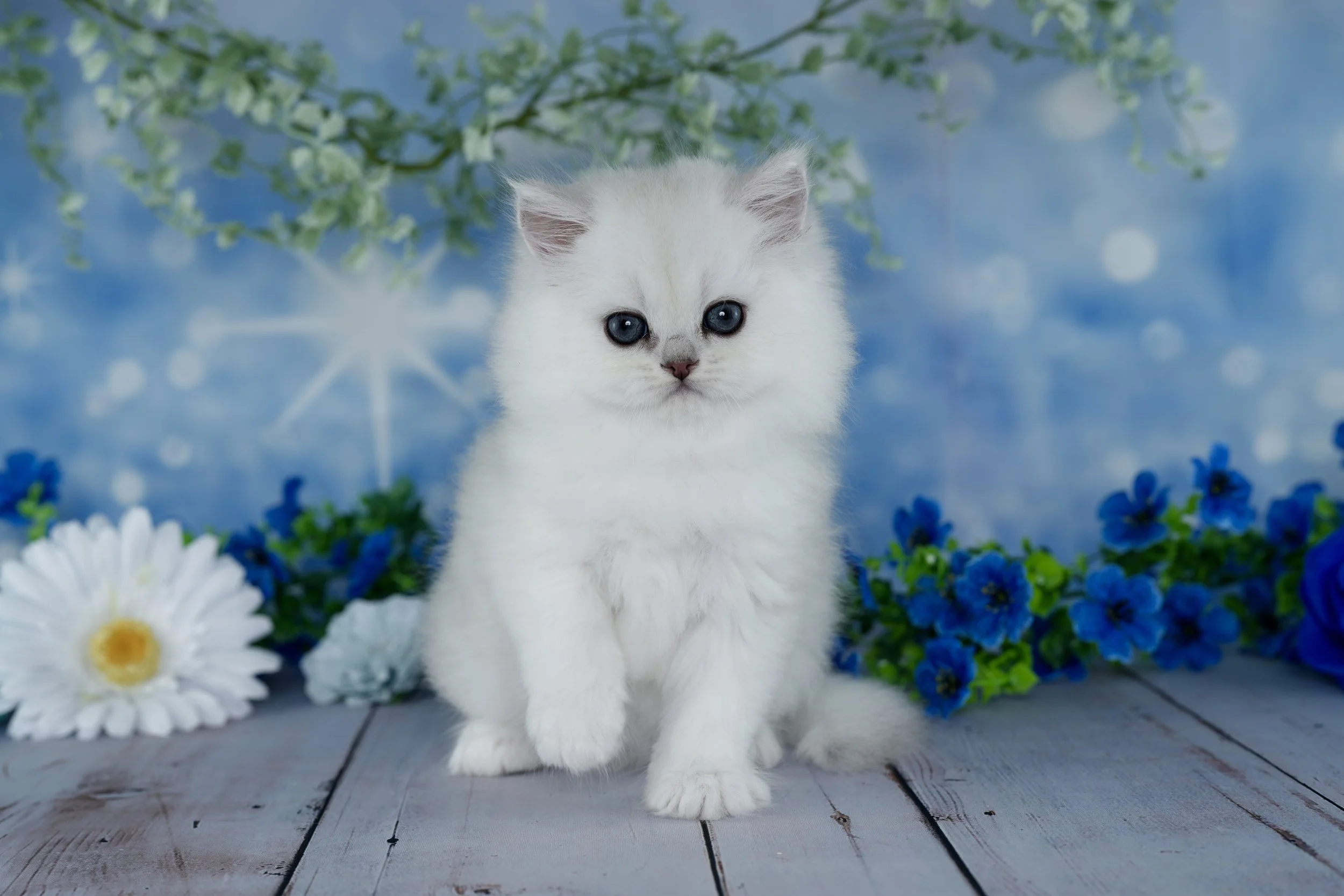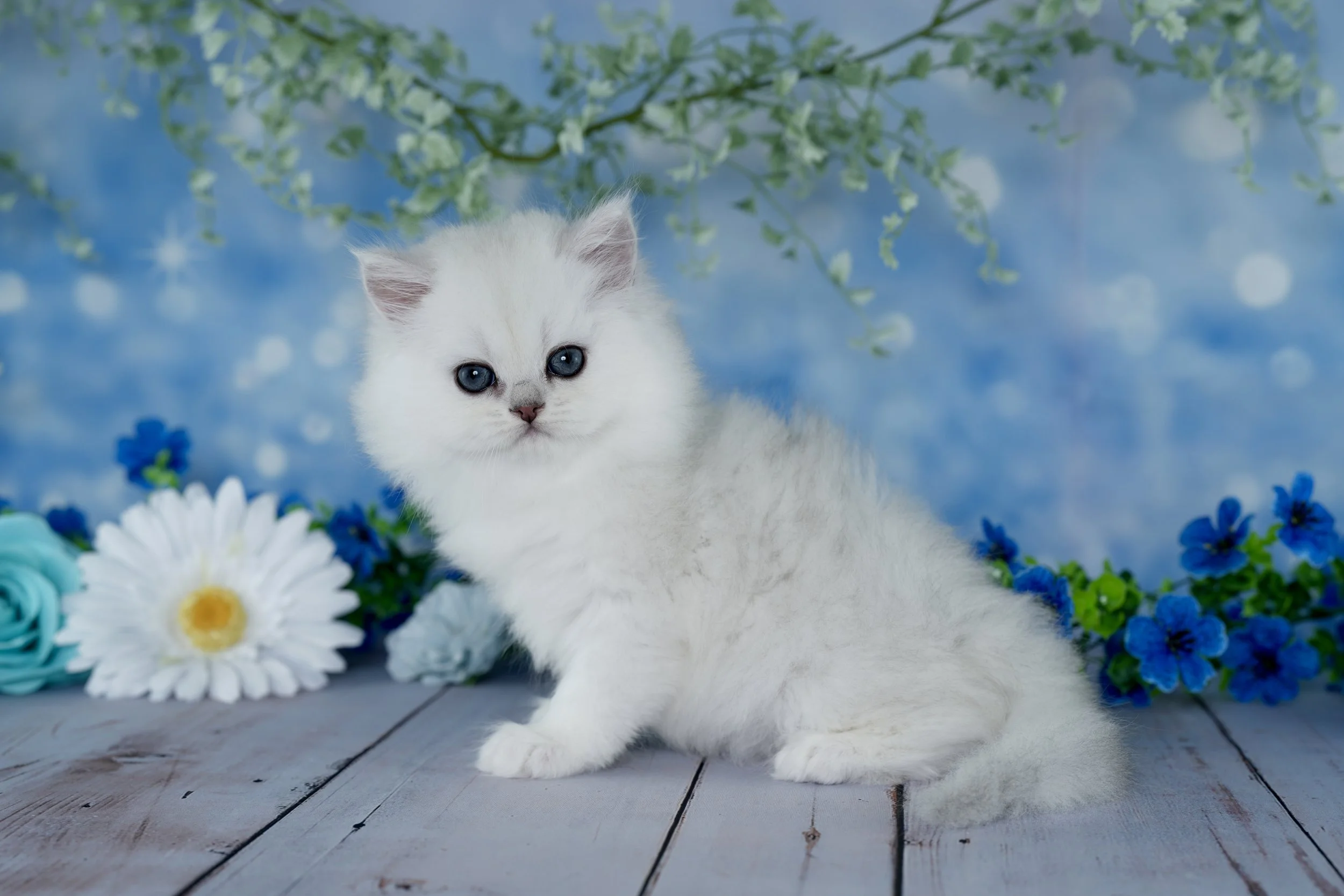 Meet CHASE - This breathtaking boy is pure snow-soft perfection. Chase has an angelic doll face with luminous sapphire eyes that glimmer like clear morning skies. His coat is a pristine, silvery white misted with the faintest silver sparkle, unique to high quality silver persians. He is a gentle, affectionate baby who loves to pose for attention. He will mature into a full coated persian with ethereal, fairytale look embodies the Dreamdoll standard.