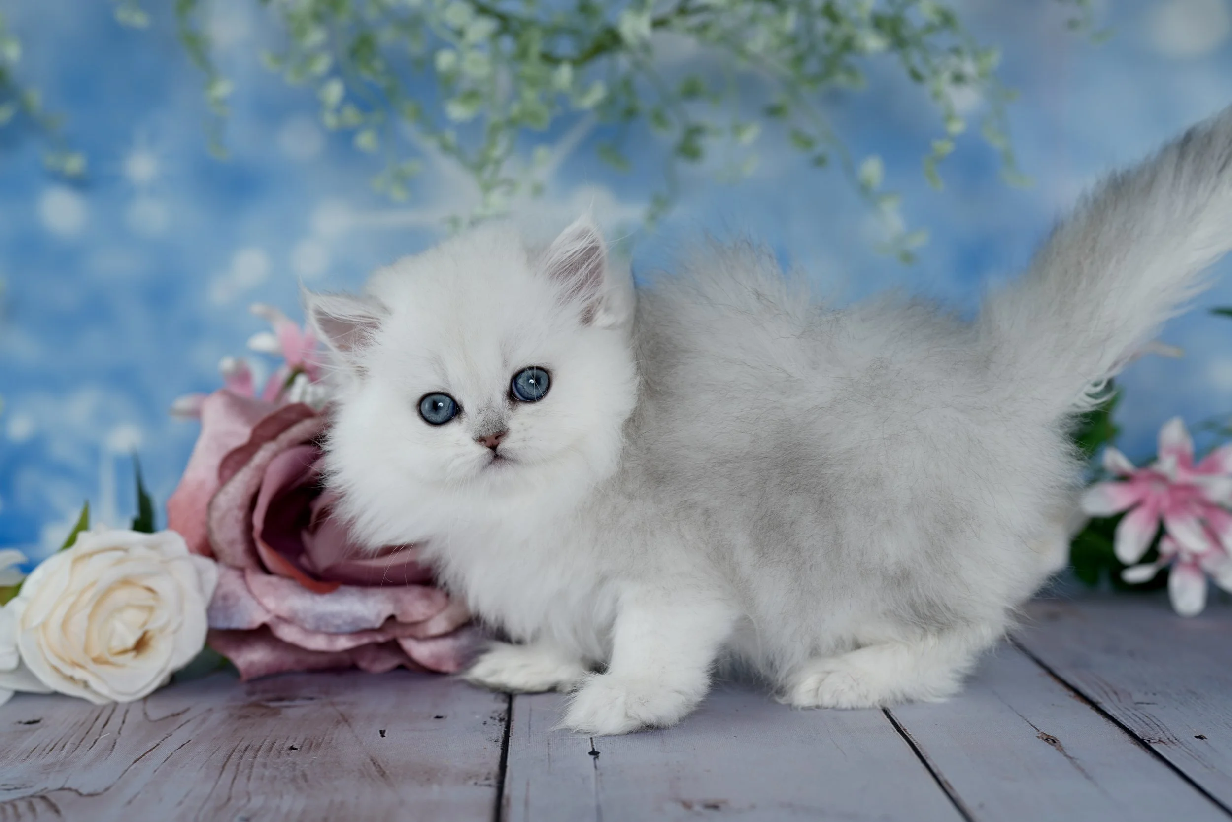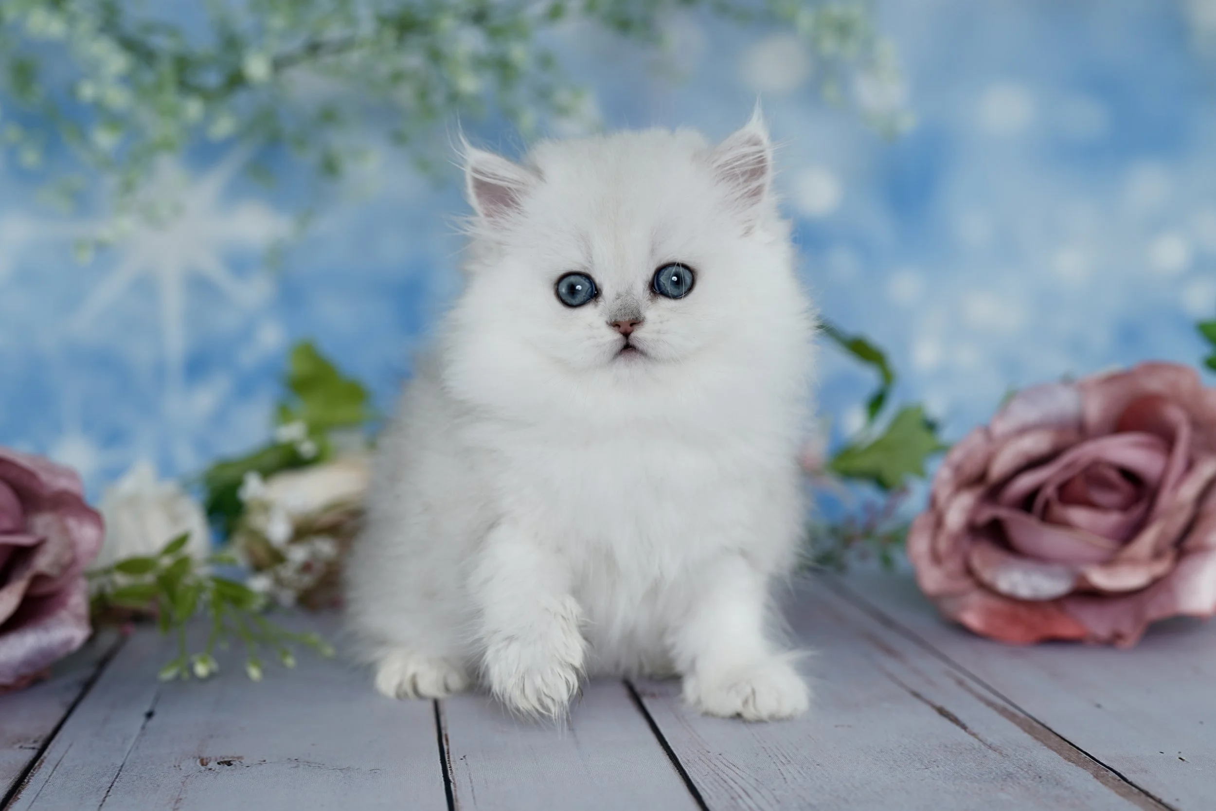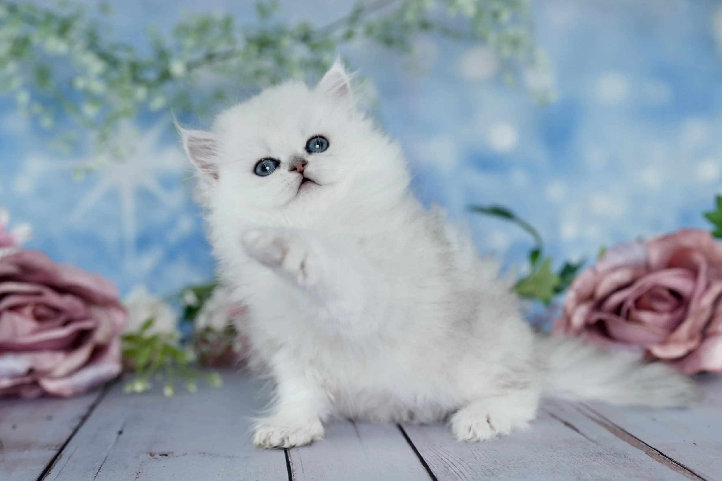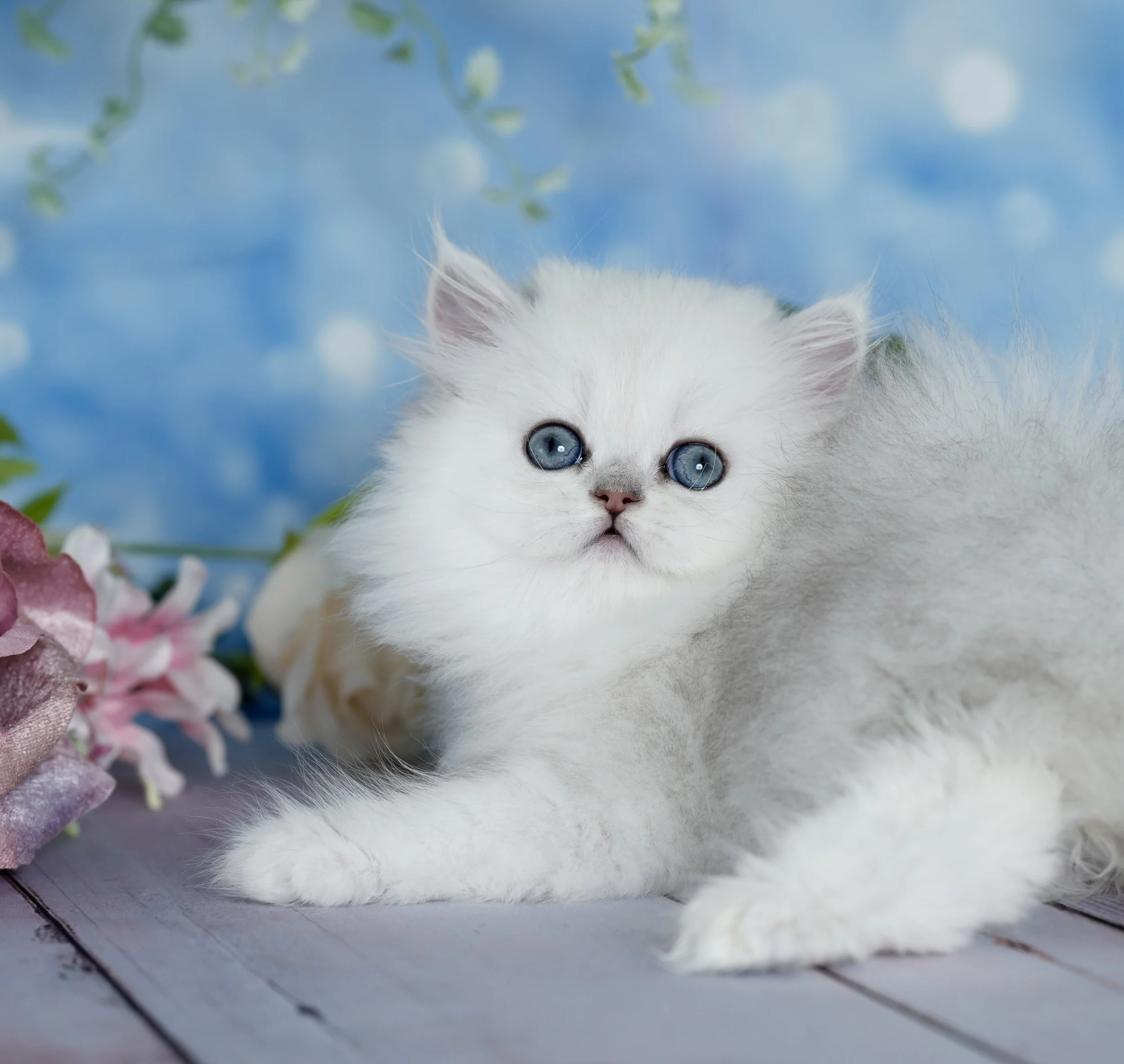 Meet Chelsea- Our dreamy light silver beauty! Chelsea is a lightly shaded silver persian with a plush, angelic coat and eyes that sparkle with sweetness . Her expression is tender and innocent, giving her a timeless doll like charm. Gentle and graceful, Chelsea is the perfect little princess for someone who loves classic beauty and a calm, loving temperament.