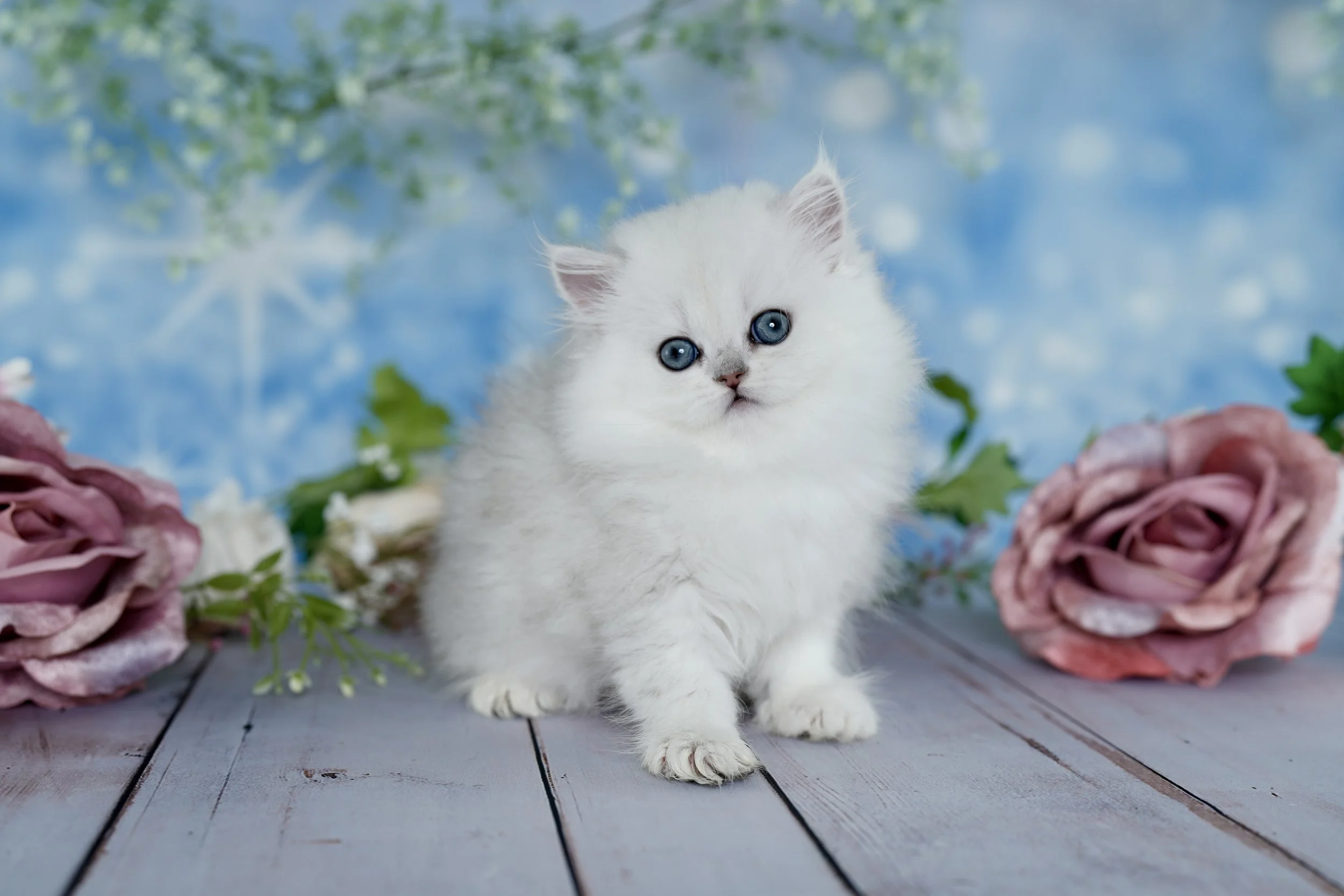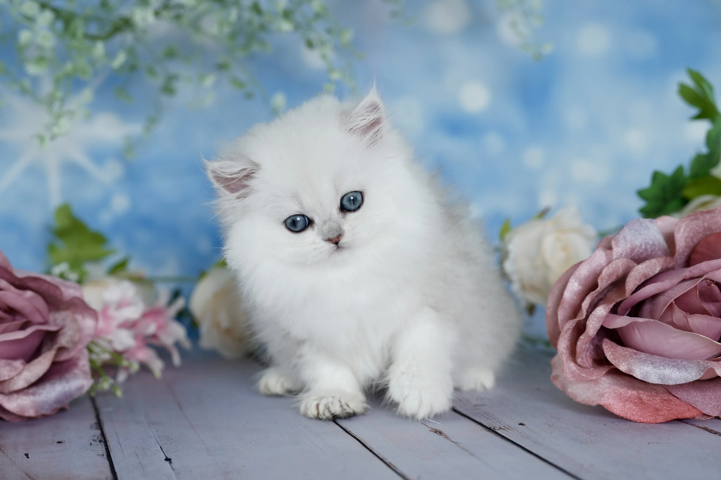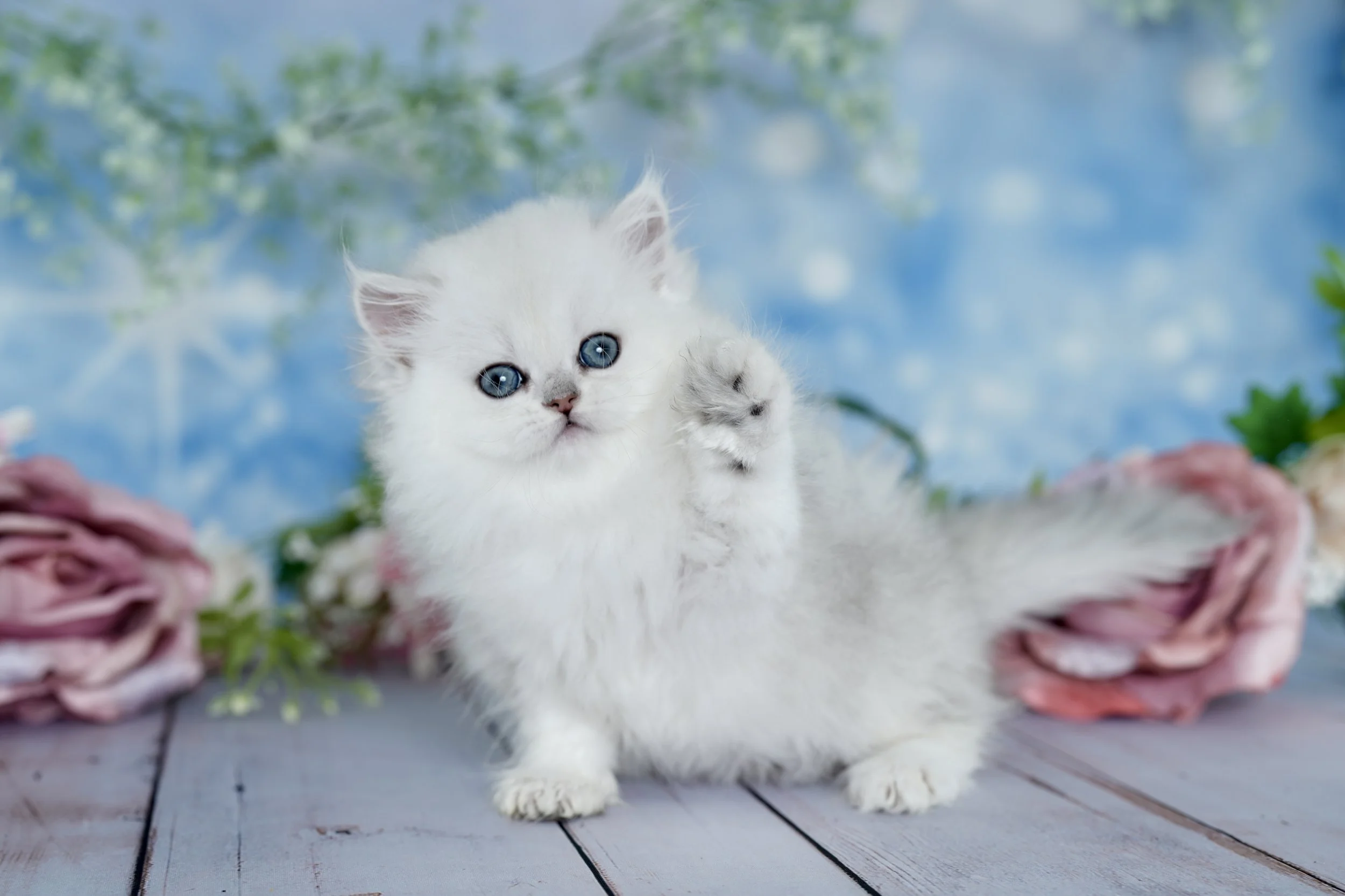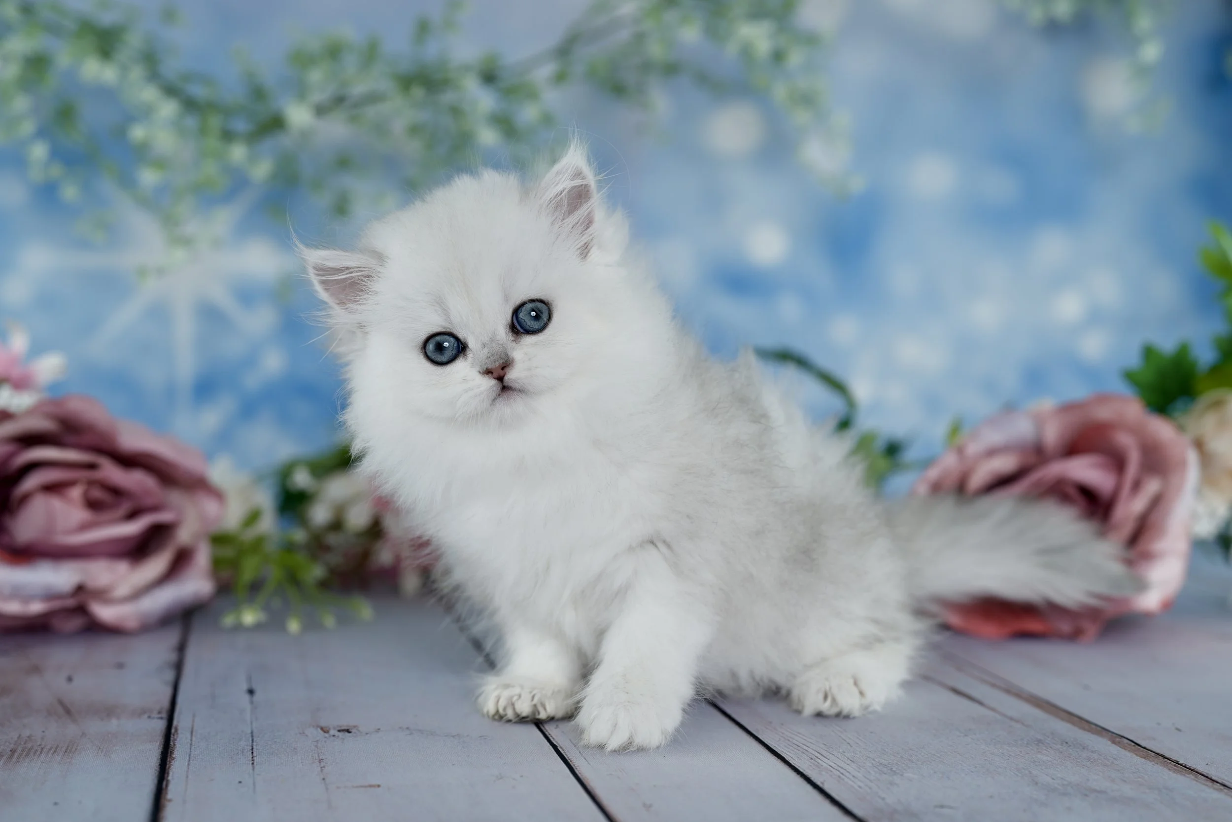 Meet Chelsea- Our dreamy light silver beauty! Chelsea is a lightly shaded silver persian with a plush, angelic coat and eyes that sparkle with sweetness . Her expression is tender and innocent, giving her a timeless doll like charm. Gentle and graceful, Chelsea is the perfect little princess for someone who loves classic beauty and a calm, loving temperament.