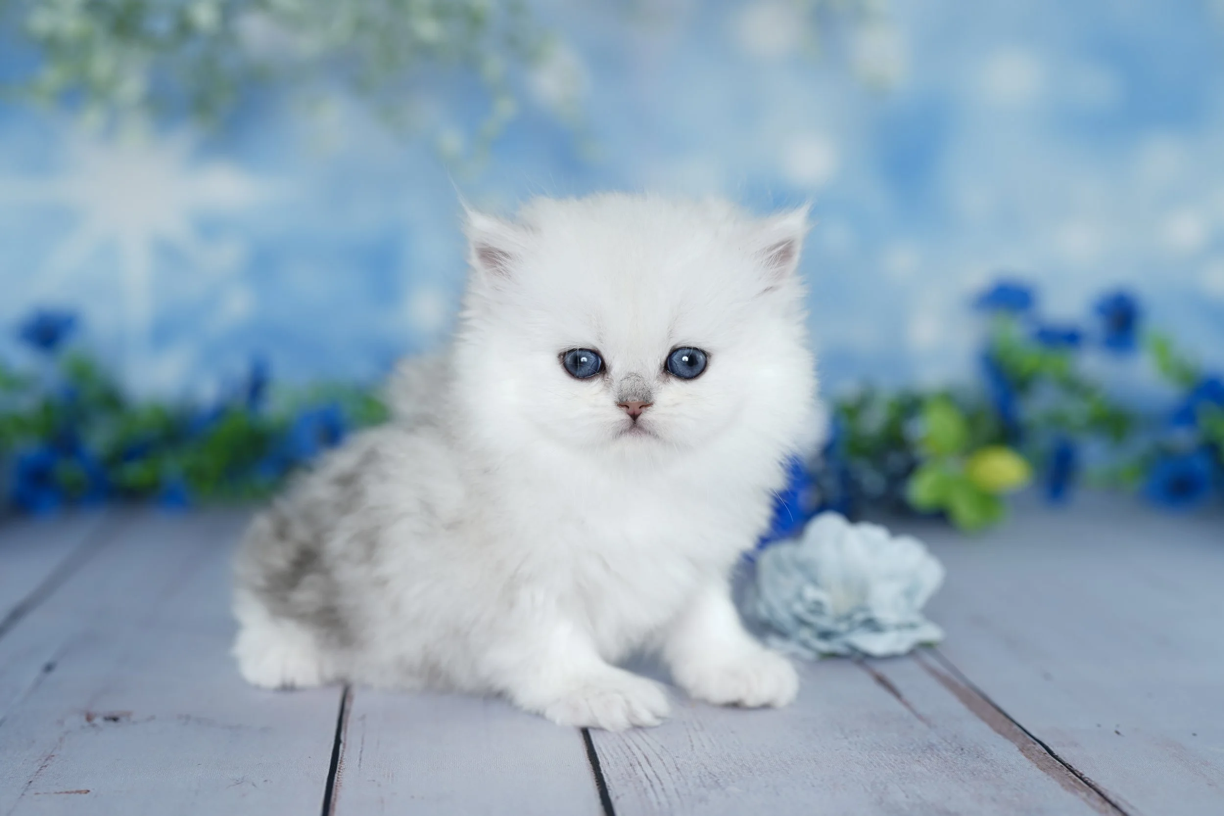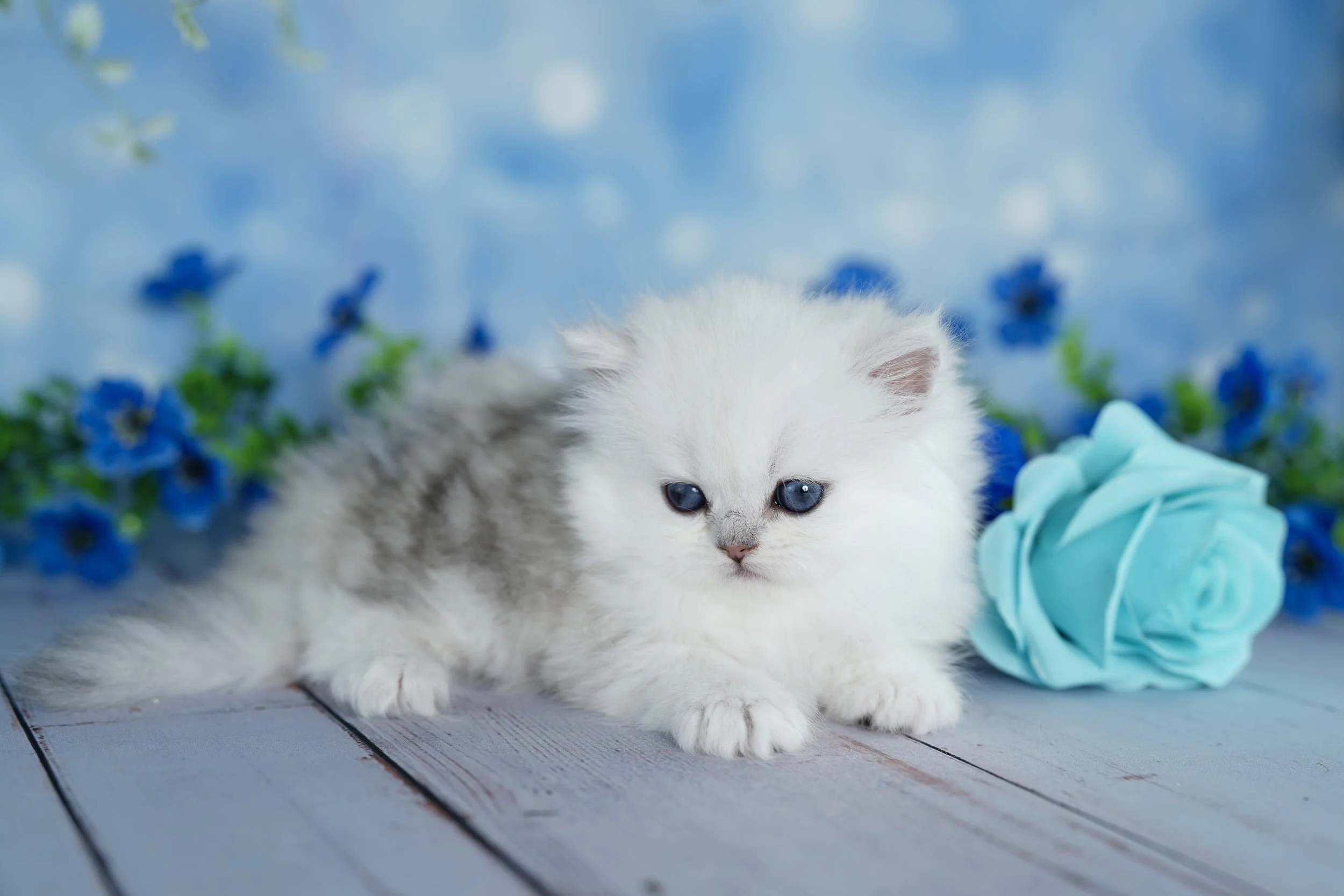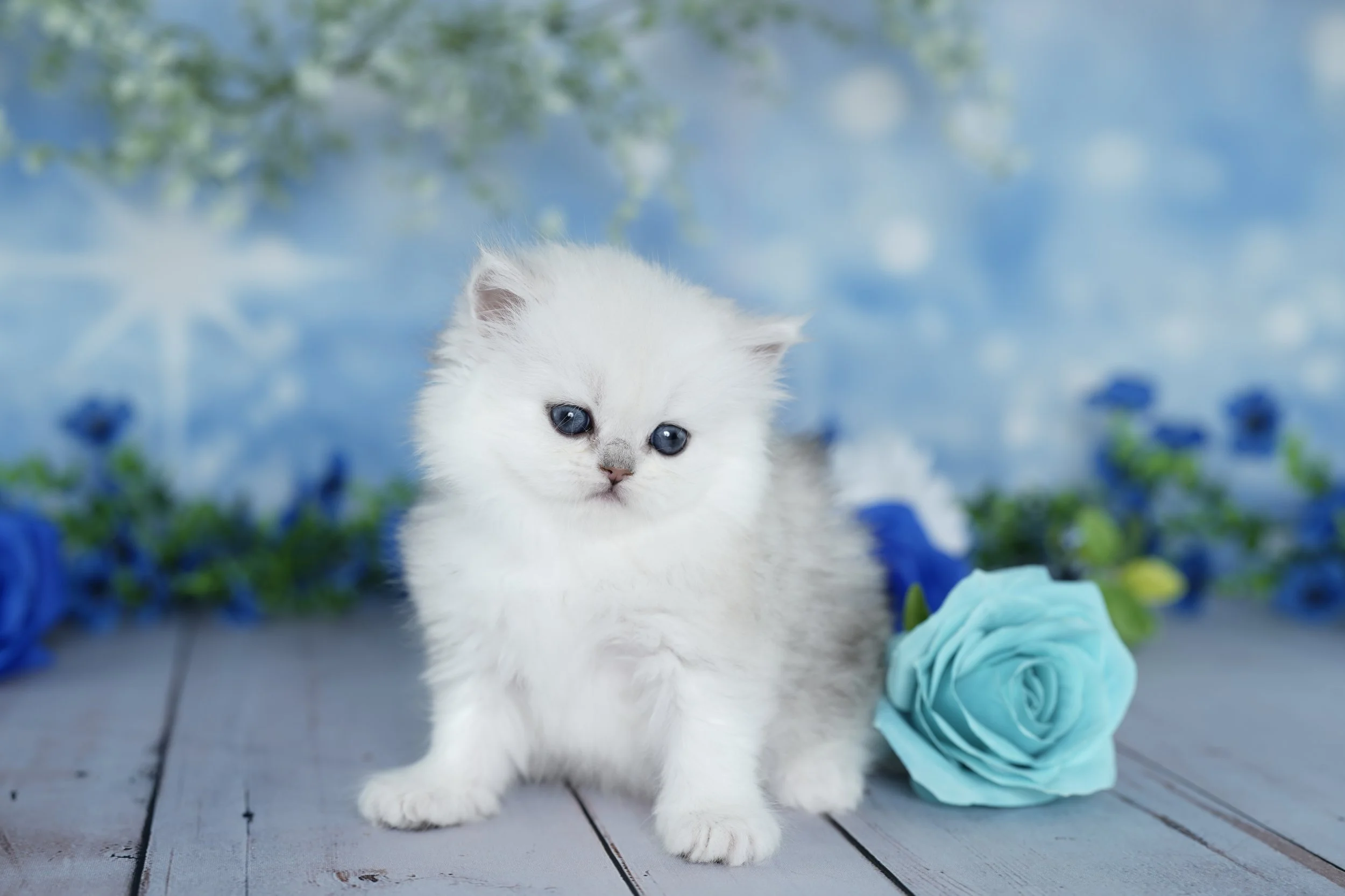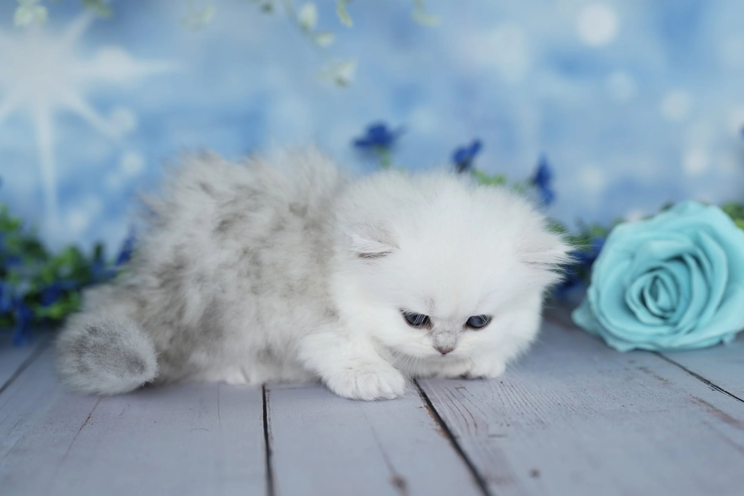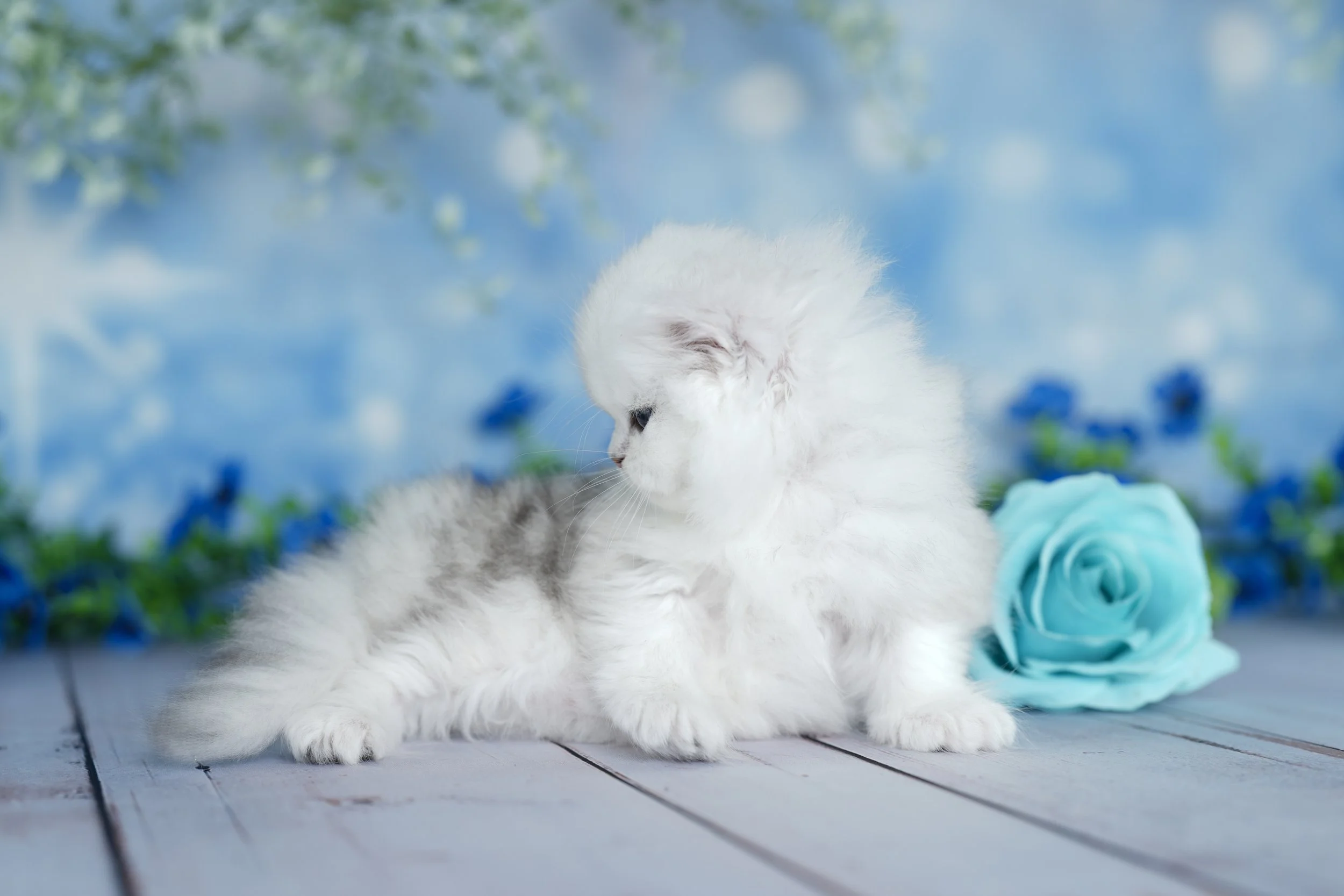 Meet Chelsea- Our dreamy light silver beauty! Chelsea is a lightly shaded silver persian with a plush, angelic coat and eyes that sparkle with sweetness . Her expression is tender and innocent, giving her a timeless doll like charm. Gentle and graceful, Chelsea is the perfect little princess for someone who loves classic beauty and a calm, loving temperament.