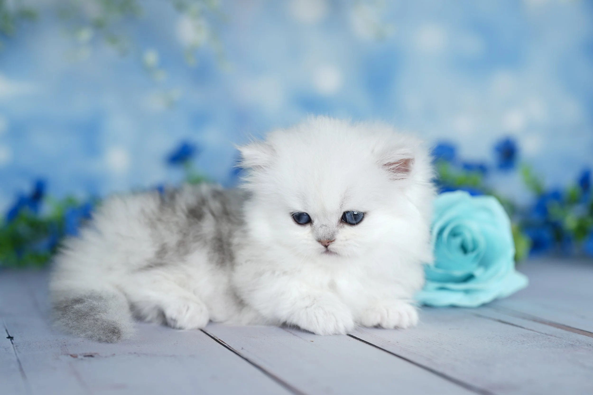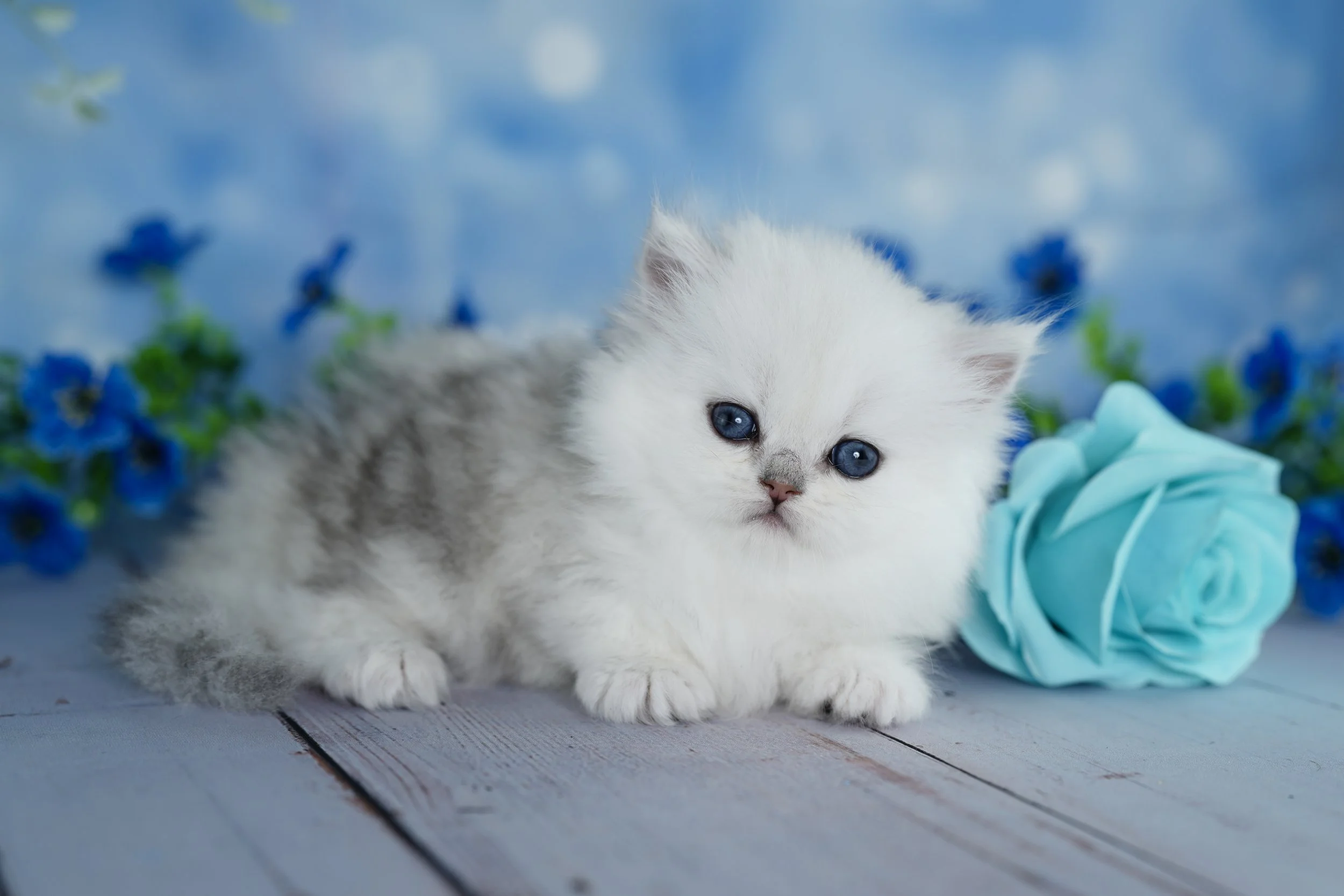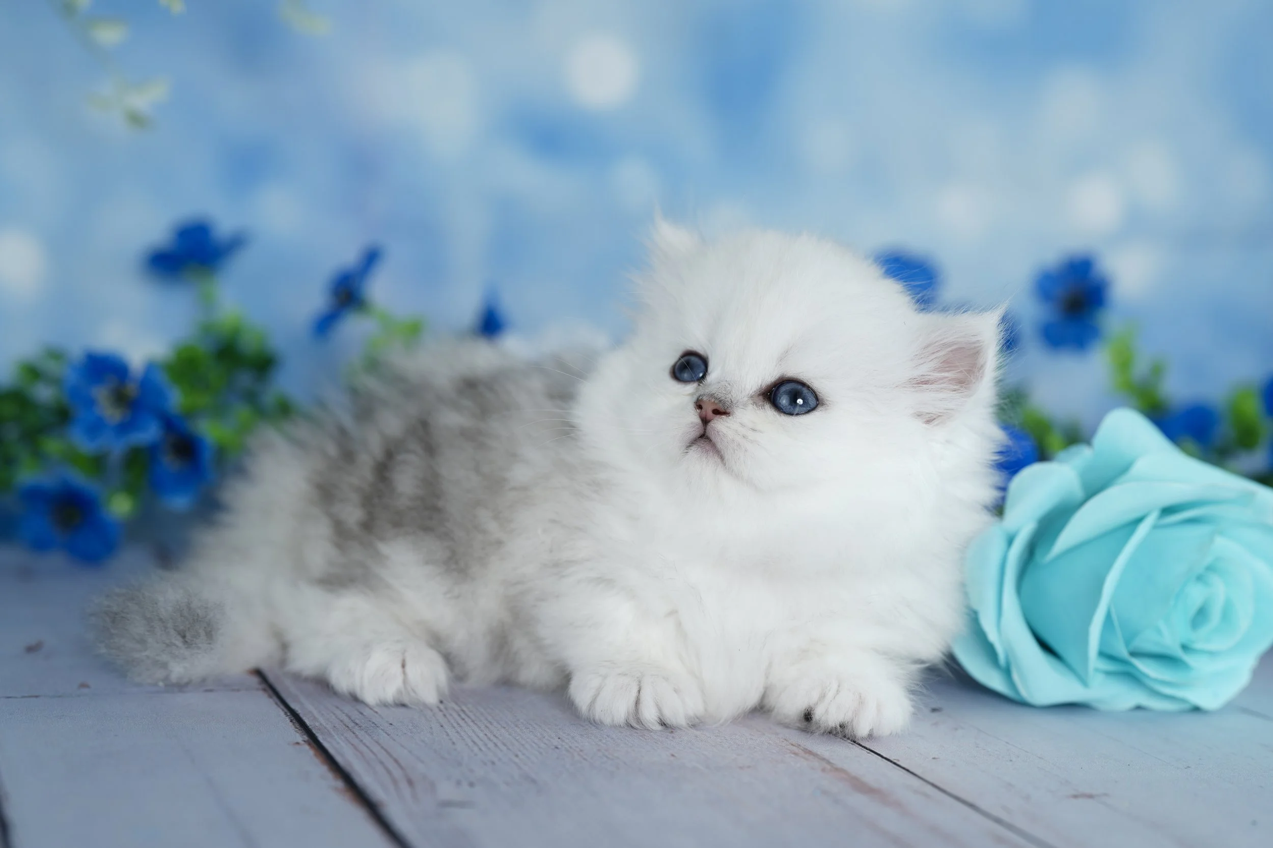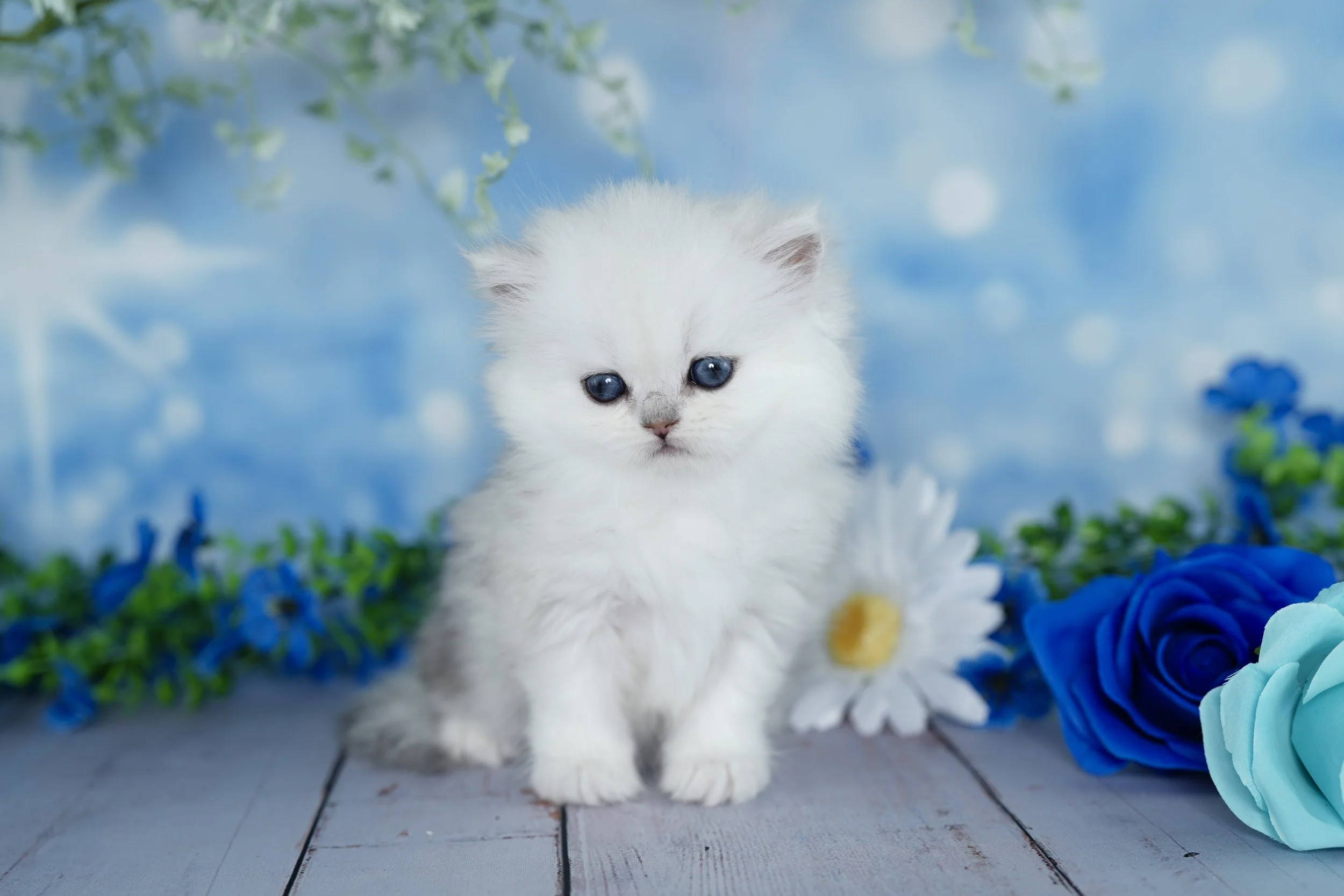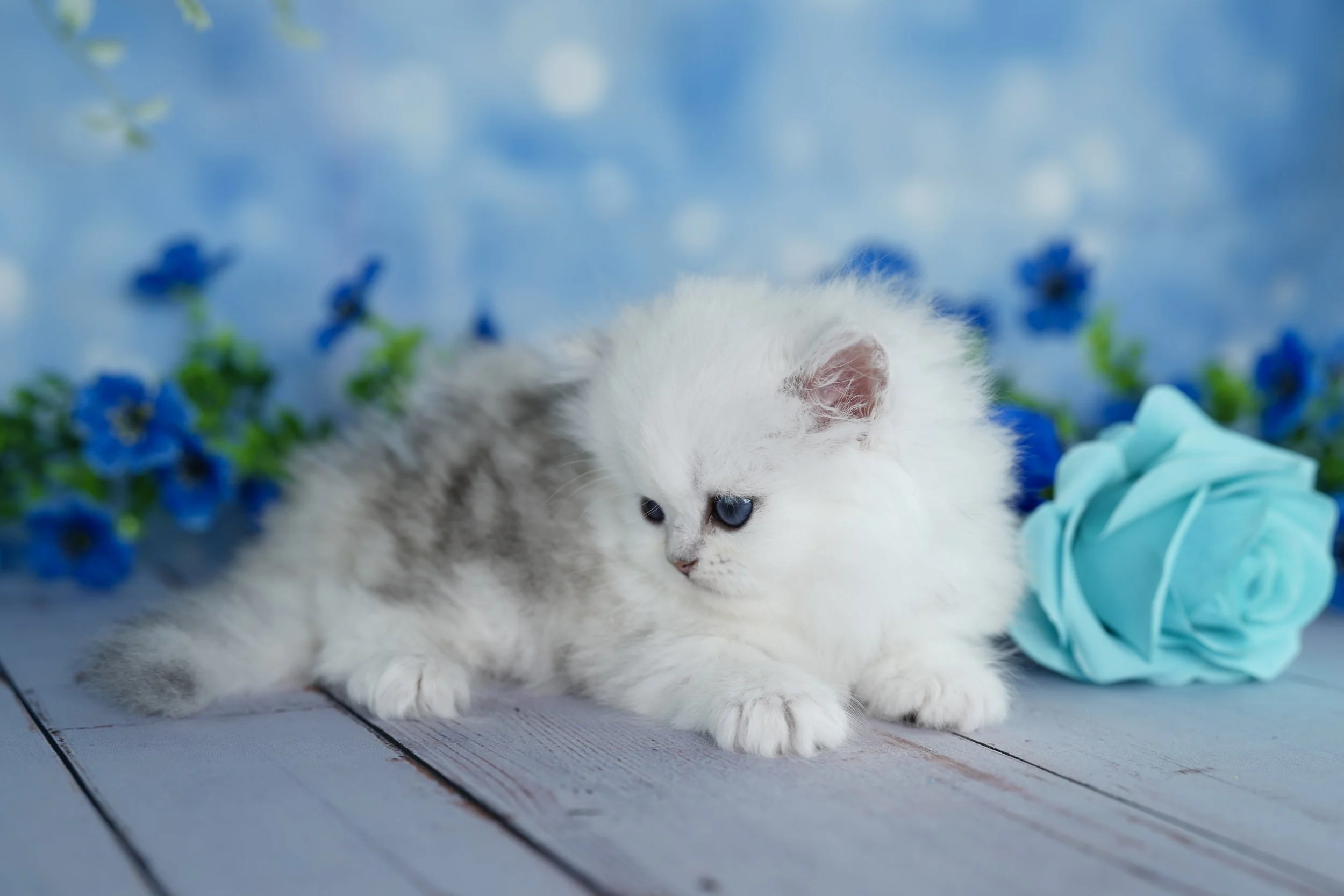 Meet Chelsea- Our dreamy light silver beauty! Chelsea is a lightly shaded silver persian with a plush, angelic coat and eyes that sparkle with sweetness . Her expression is tender and innocent, giving her a timeless doll like charm. Gentle and graceful, Chelsea is the perfect little princess for someone who loves classic beauty and a calm, loving temperament.