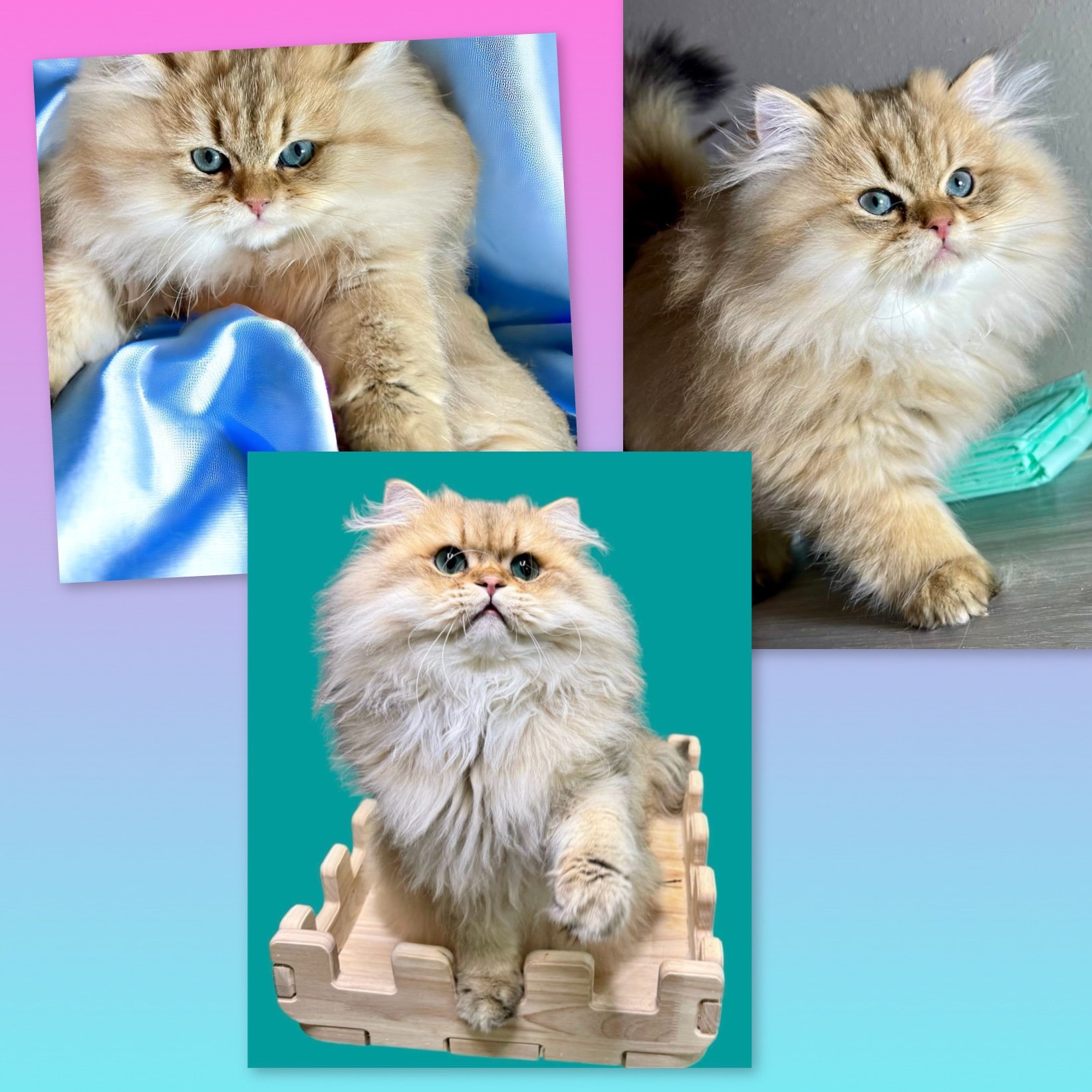 Sebastian is a stunning imported chinchilla silver male. He has gorgeous emerald green eyes, wonderful short stocky structure, and a perfect sweet teddy bear like face. He is truly one of the most perfect Chinchillas I have ever laid eyes on. He is currently clipped down, but his coat will grow back in quickly. He does have a massive coat, and regular grooming will be essential for him. He will need his eyes cleaned regularly to keep him looking his best. He is a sweet, laid back boy who loves attention! He does well with other sweet and gentle cats, and does great with children. Neuter contract required.